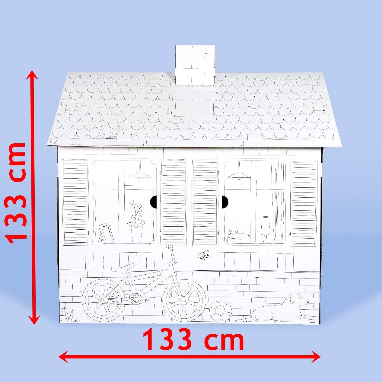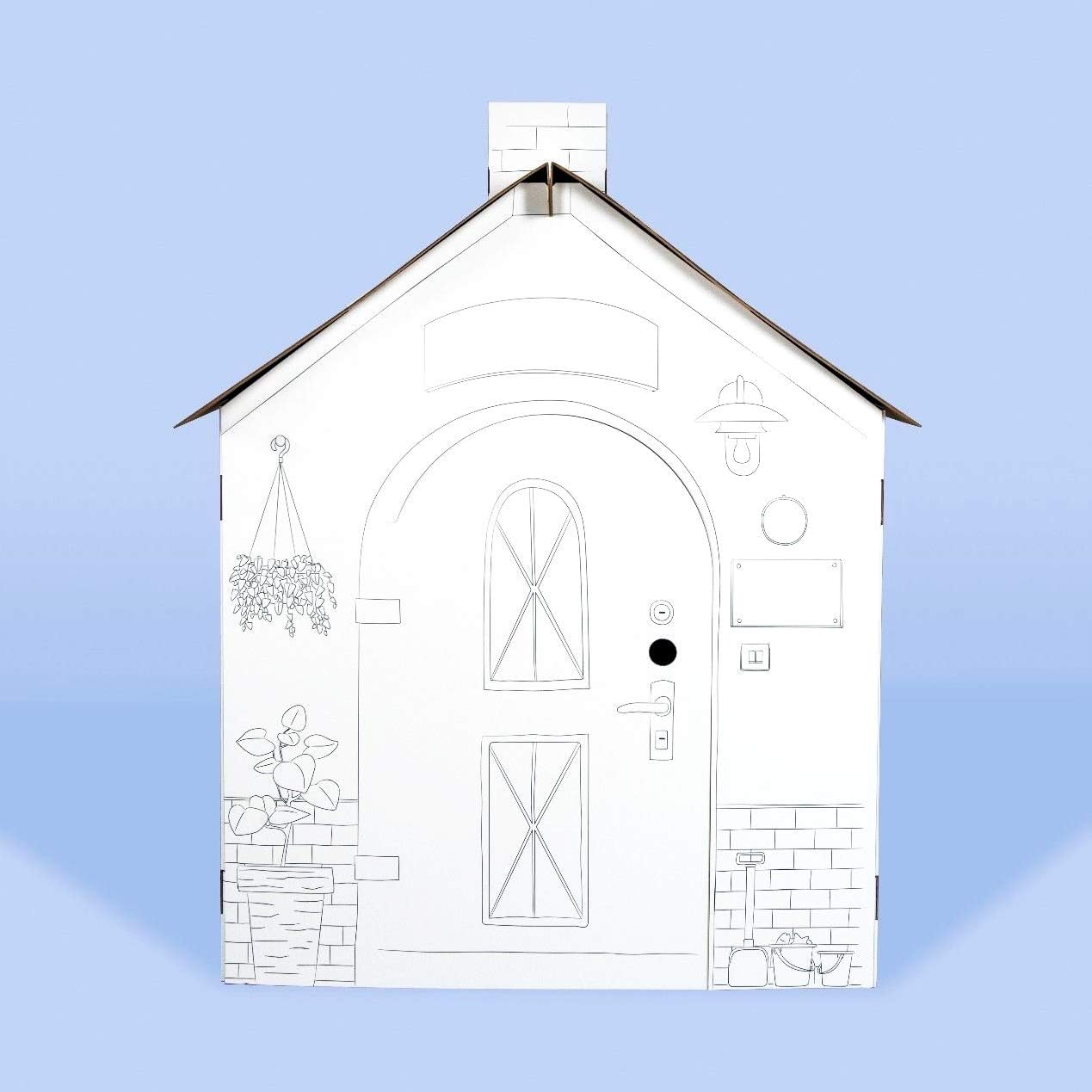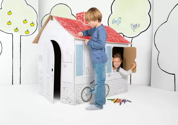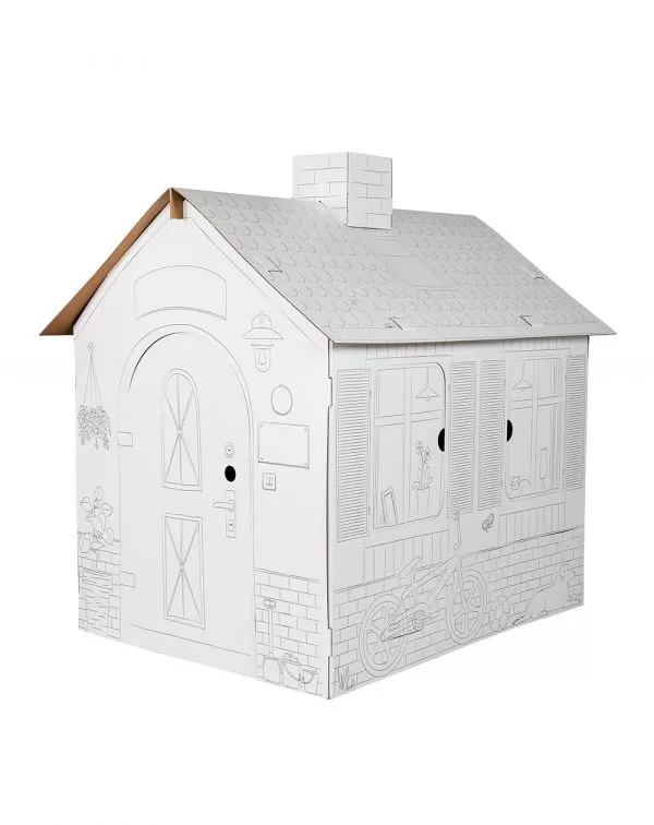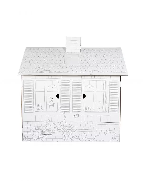 Esta casinha de cartão para colorir permite às crianças montar a sua própria casa e personalizá-la com lápis de cor, marcadores ou tintas. As portas e janelas abrem e fecham, tornando a brincadeira ainda mais realista.