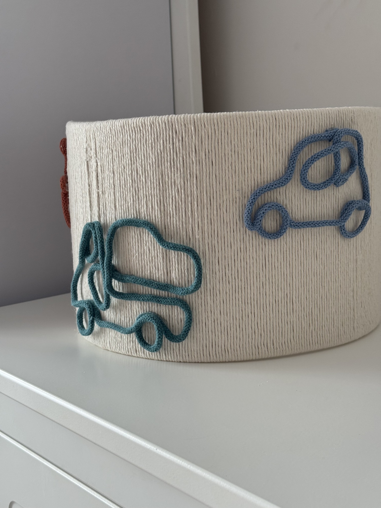 • Cesto de tecido bege com desenhos coloridos de carros, em cima de móvel branco