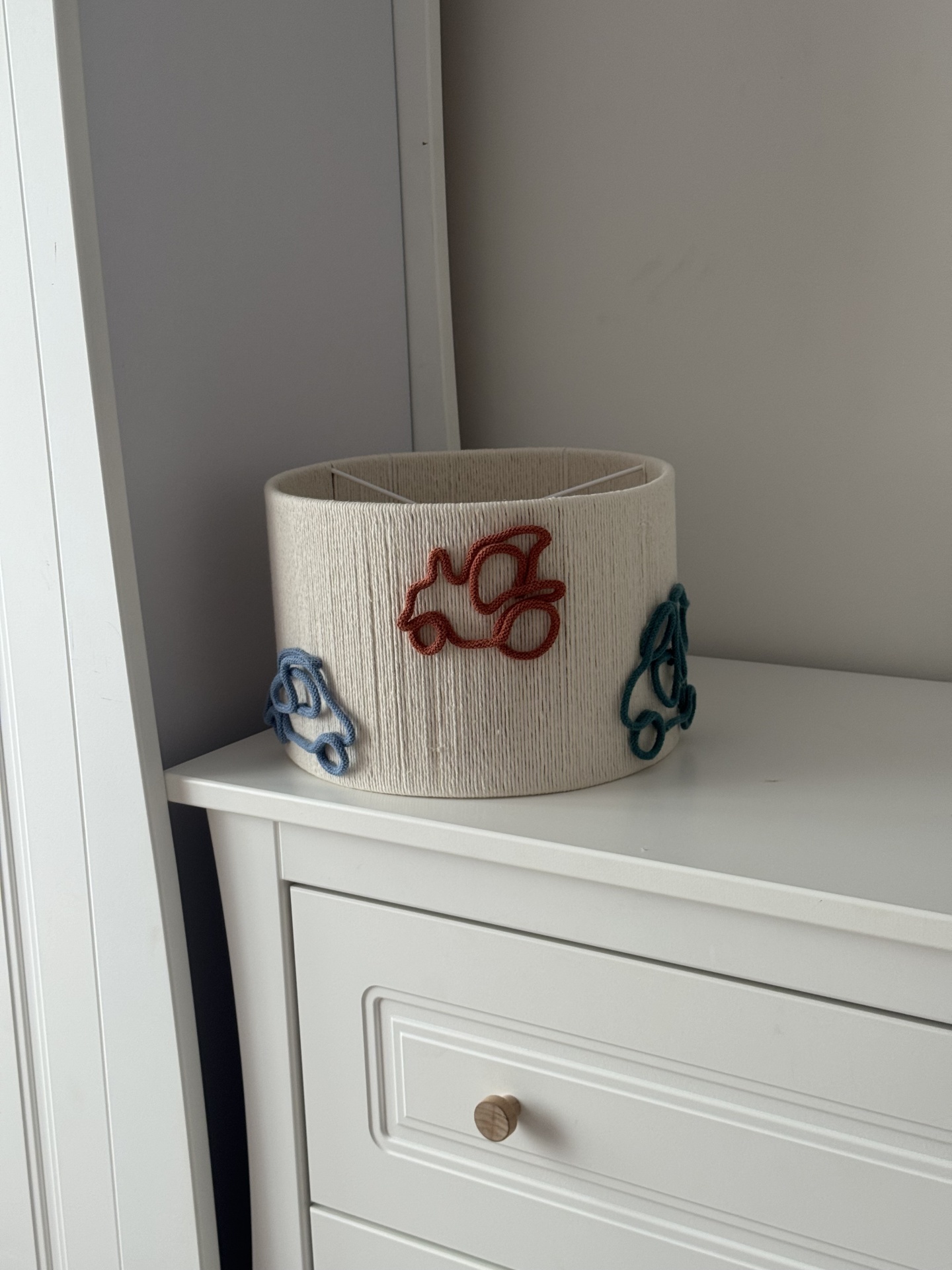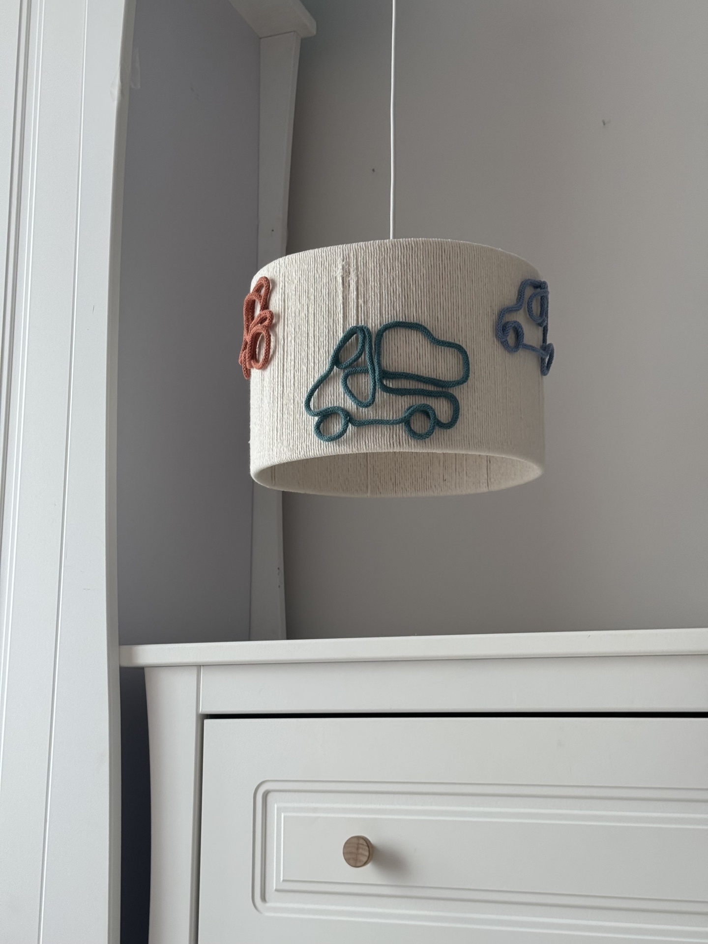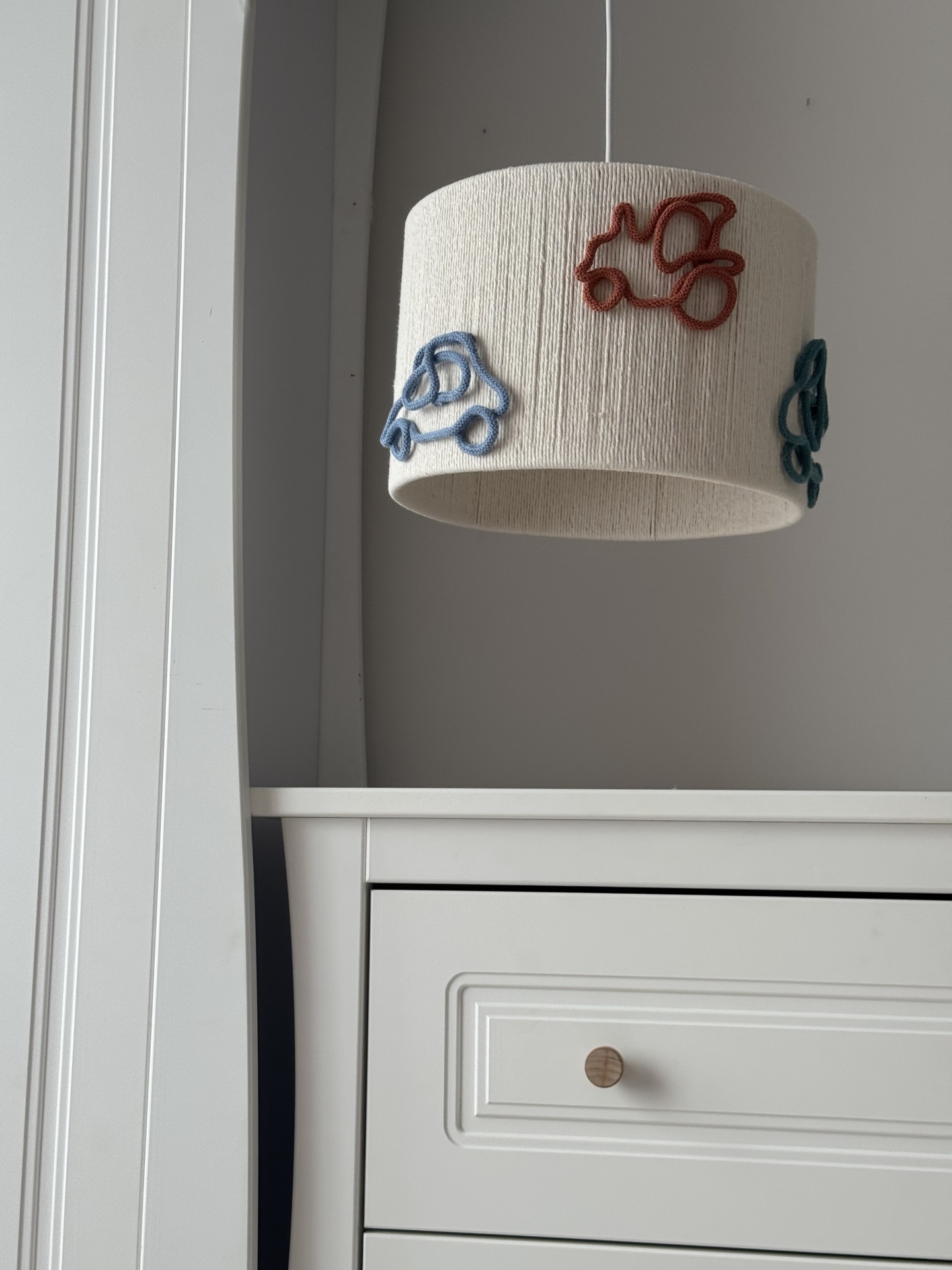 Deixe o quarto dos pequenos cheio de alegria e aventura com a Luminária Infantil Veículos da Marangga Kids. Feita à mão com barbante de algodão natural, apresenta delicados apliques de carros, tratores e caminhões, combinando decoração lúdica e luz suave para momentos de brincadeira, leitura ou descanso.