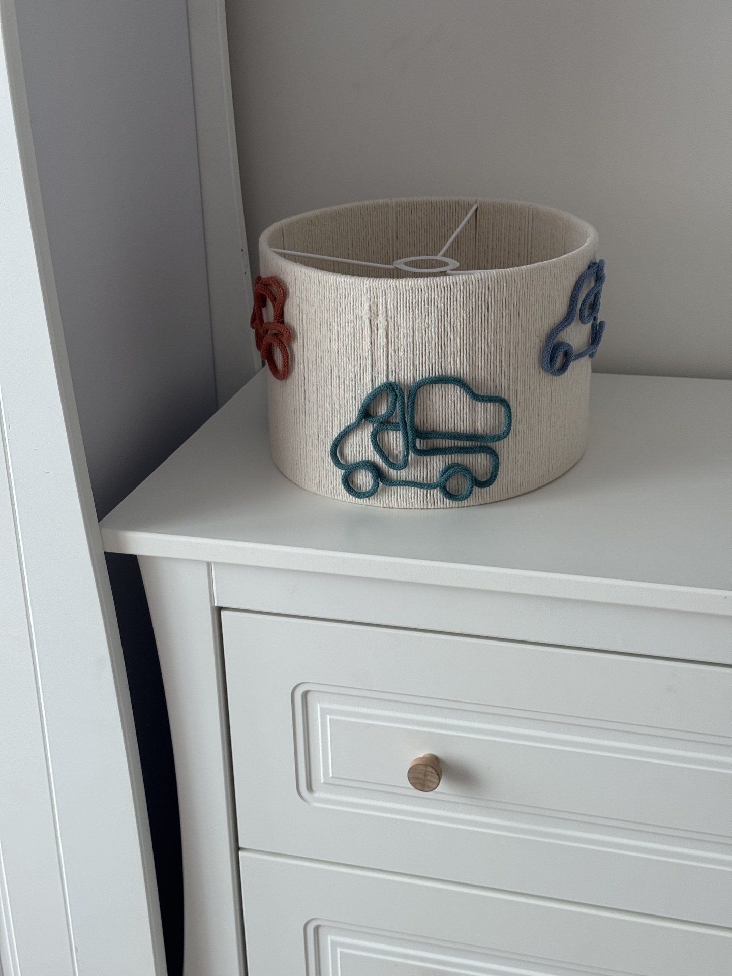 Candeeiro de tecto branco com padrão de carros coloridos pendurado numa parede cinza clara sobre uma cómoda branca Candeeiro de teto de tecido com decoração de carros coloridos sobre móvel branco Abajur branco com carrinhos coloridos numa cómoda branca Cesto branco de tecido com decoração de carros em linha azul e verde Cesto de tecido bege com desenhos coloridos de carros, em cima de móvel branco Quarto com cama branca, almofadas cinza e azul, candeeiro de teto bordado com carros, parede cinza e cómoda branca. Candeeiro suspenso branco de design simples