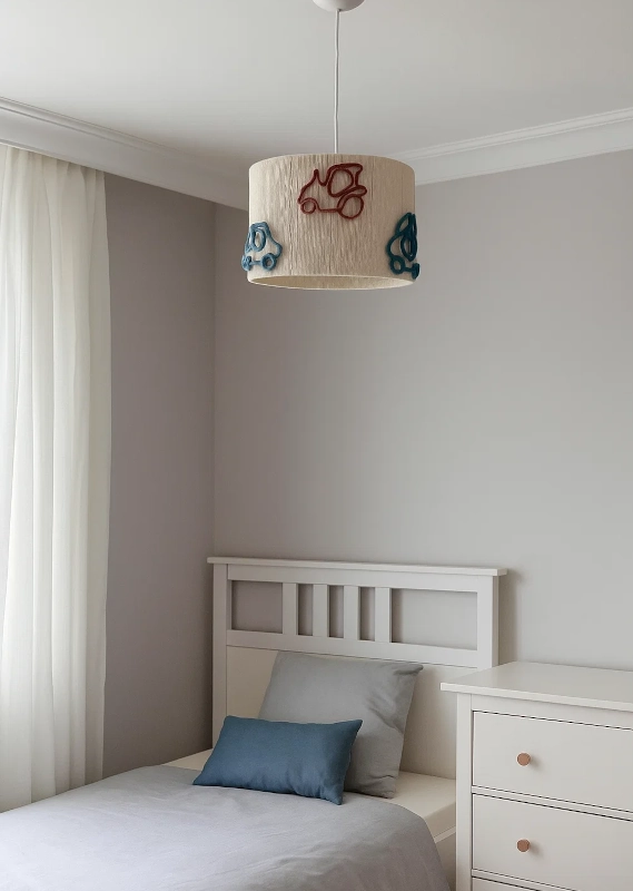 • Candeeiro de teto de tecido com decoração de carros coloridos sobre móvel branco