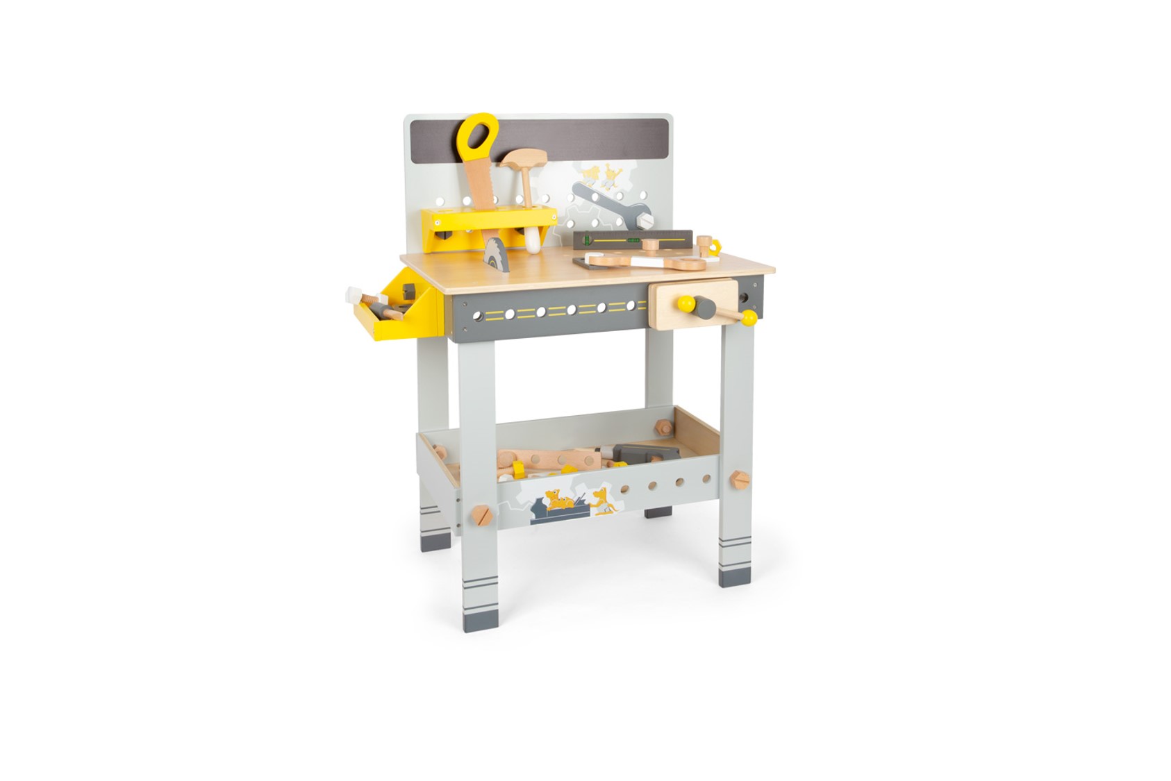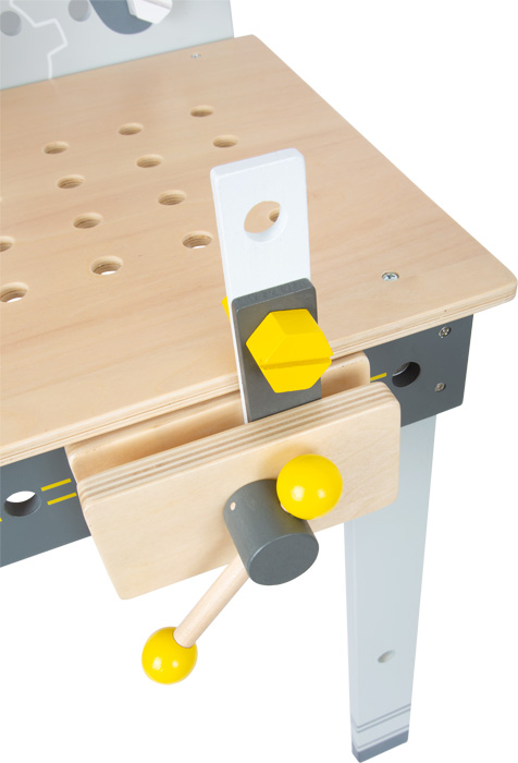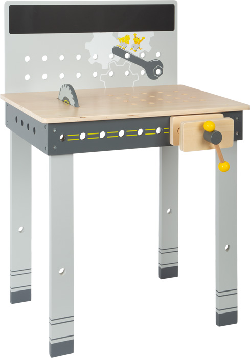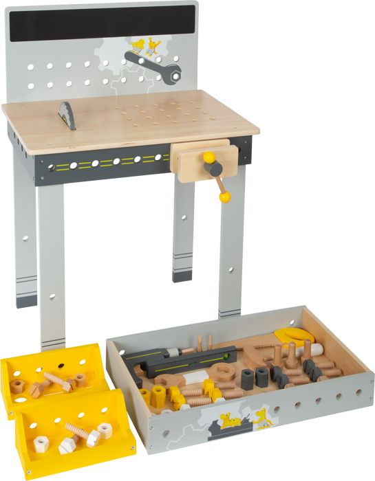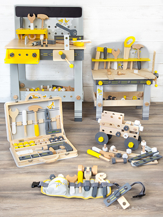 Ferramentas realistas: inclui 8 ferramentas de madeira – serra circular, chave de fenda sem fio com 3 pontas intercambiáveis, nível de bolha, torno, martelo, chave inglesa, chave de fenda e serra.