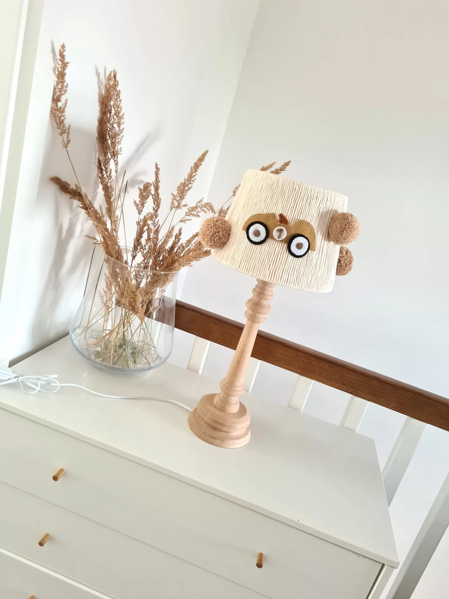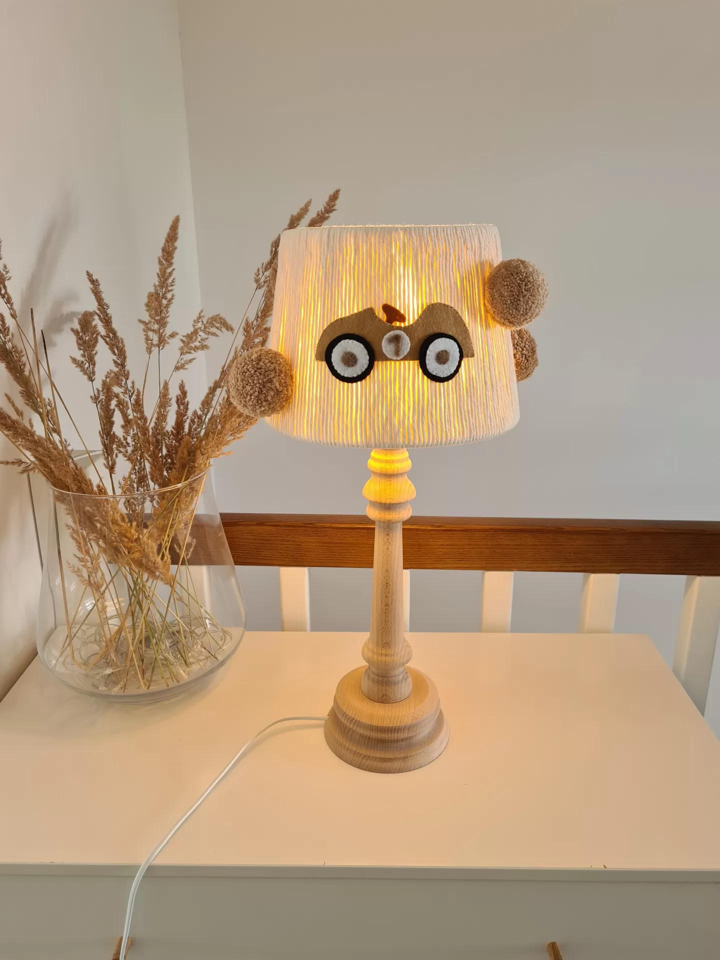 • Candeeiro de mesa de madeira clara com abat-jour decorado com pompons e carrinho, ao lado de vaso com ramos secos