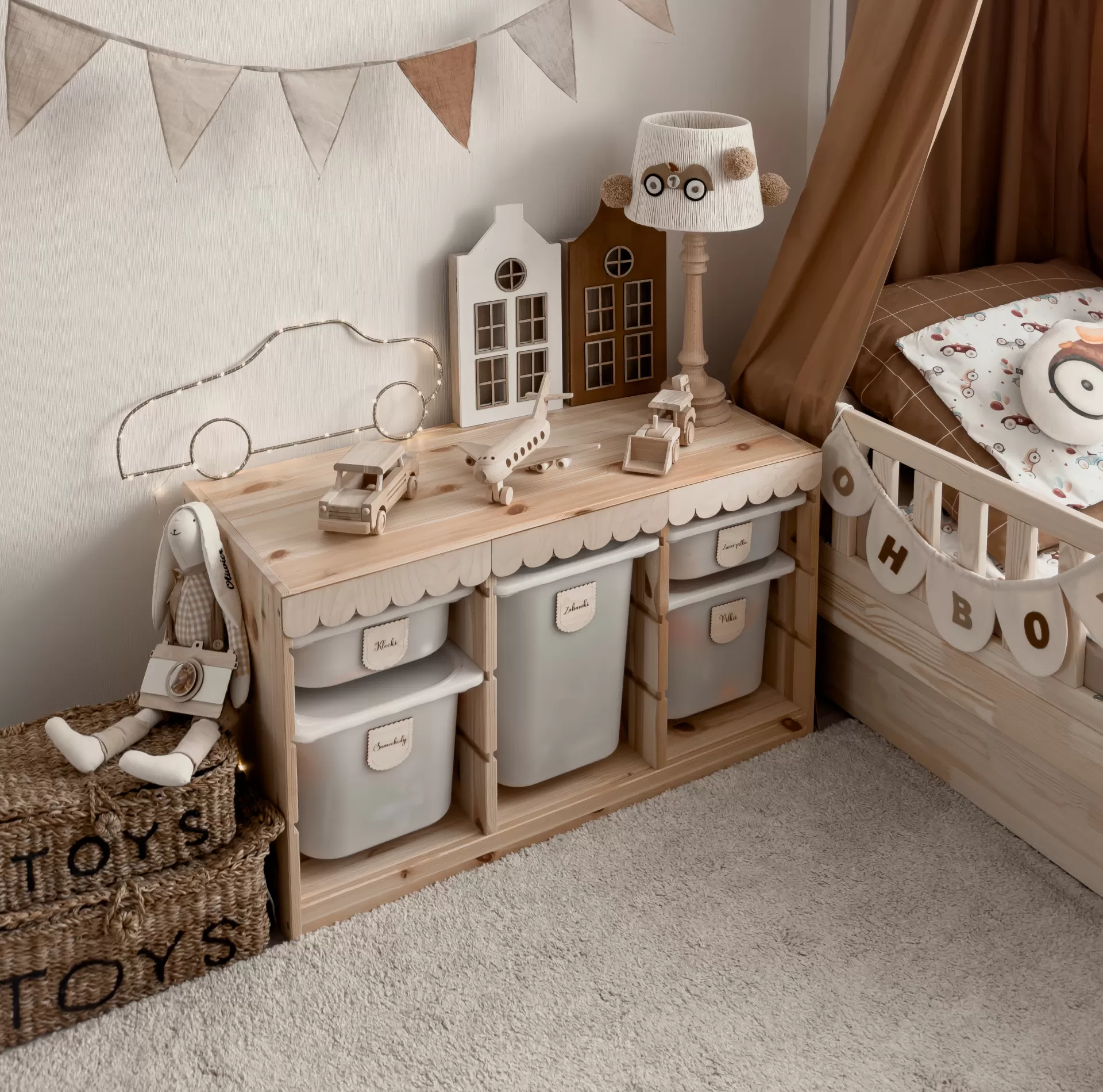 • Móvel de madeira com caixas plásticas e brinquedos num quarto infantil