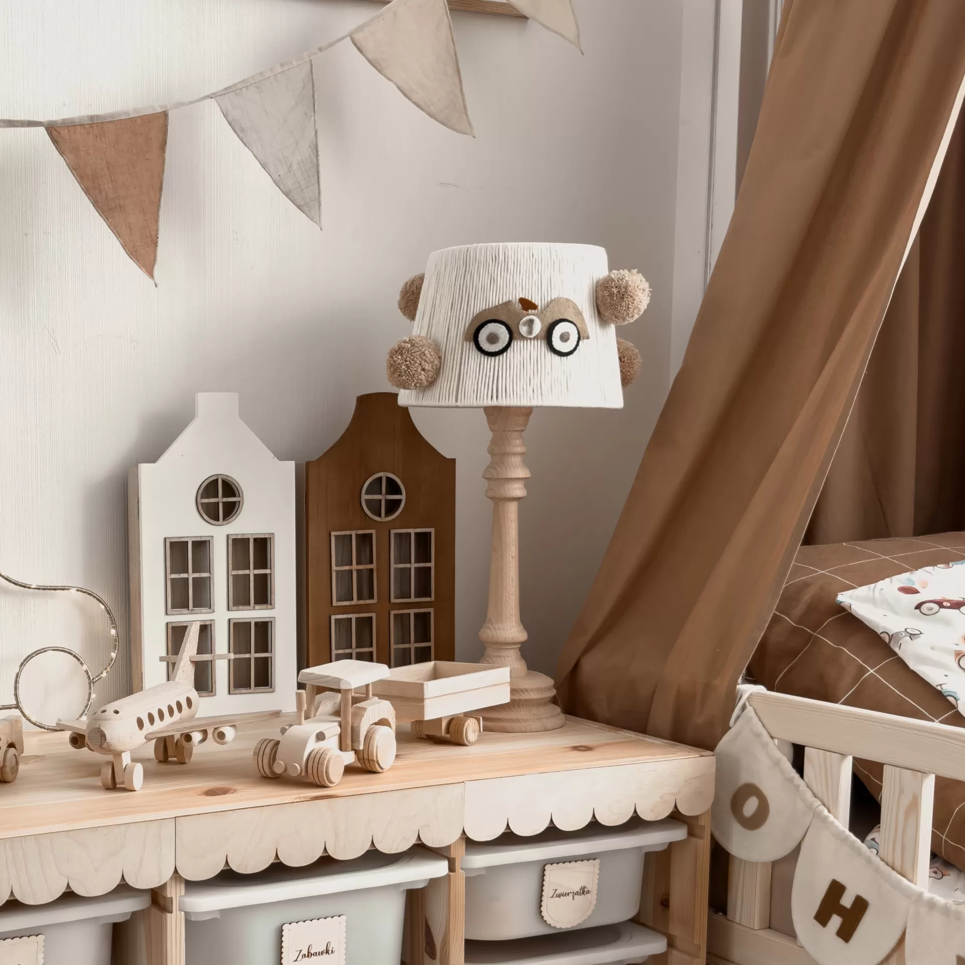 • Candeeiro de mesa branco com decoração de carrinho e ursinhos, brinquedos de madeira numa mesa de madeira clara, cortinas castanhas e bandeirolas de tecido.
