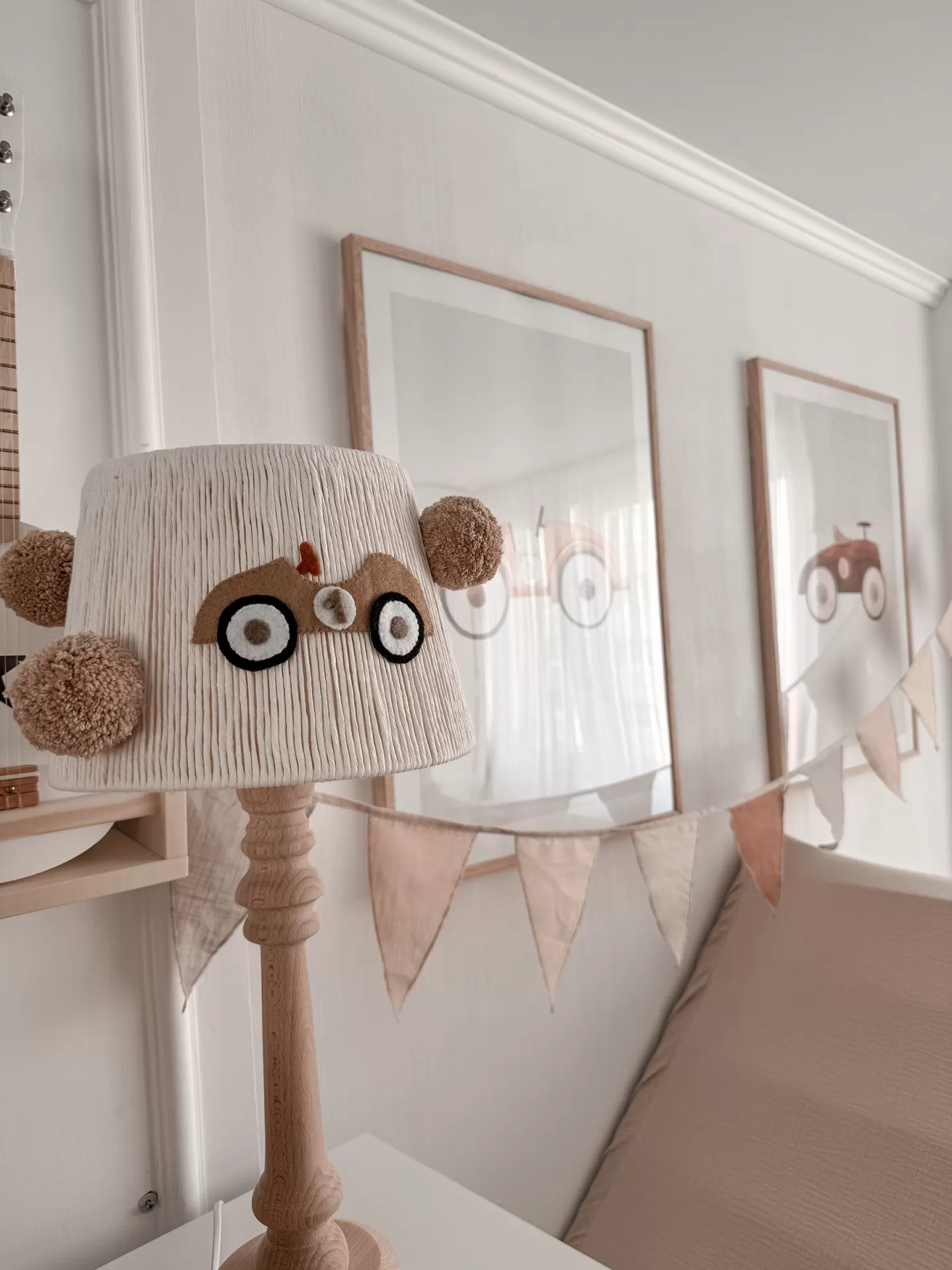 Candeeiro de mesa de madeira clara com abat-jour decorado com pompons e carrinho, ao lado de vaso com ramos secos Móvel de madeira com caixas plásticas e brinquedos num quarto infantil Secretária de madeira clara com cadeirão infantil branco, computador portátil, candeeiro de mesa com coruja e cesta tecida em forma de casa Abajur de madeira com cúpula bege e aplique de carrinho junto a quadros e bandeirolas numa sala clara. Candeeiro de mesa branco com decoração de carrinho e ursinhos, brinquedos de madeira numa mesa de madeira clara, cortinas castanhas e bandeirolas de tecido. Candeeiro de mesa de madeira com abat-jour bege e carrinho de pelúcia Candeeiro de mesa com base de madeira clara e cúpula creme decorada com apliques redondos em padrão de olhos Abajur de madeira e tecido com pompons e botões sobre cómoda branca, ao lado de vaso de vidro com ramos secos. Quarto infantil com decoração incluindo cestos de palha, guitarra branca, candeeiro com abajur decorado com carro, brinquedo de madeira e quadro com ilustração de carro.