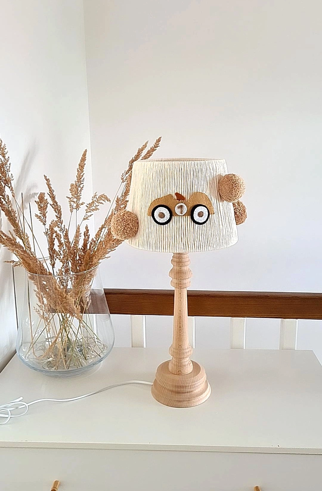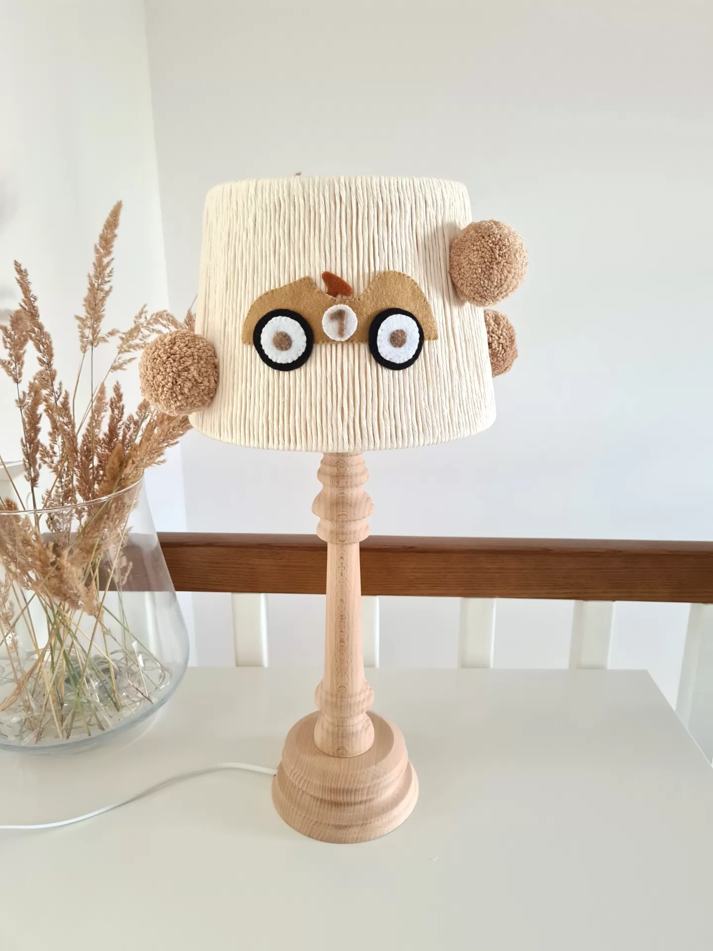 • Candeeiro de mesa com base de madeira clara e cúpula creme decorada com apliques redondos em padrão de olhos