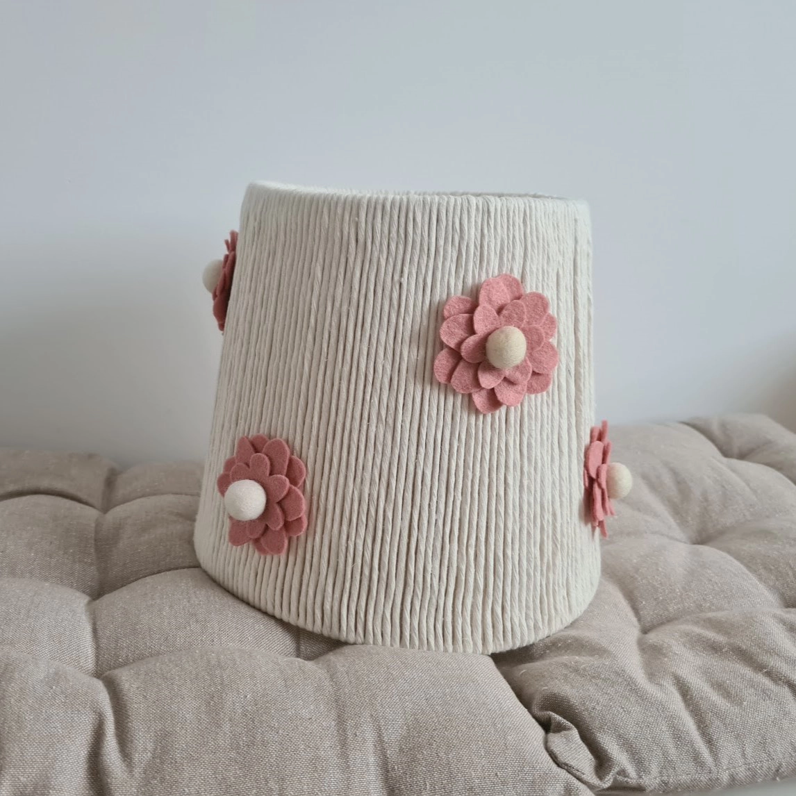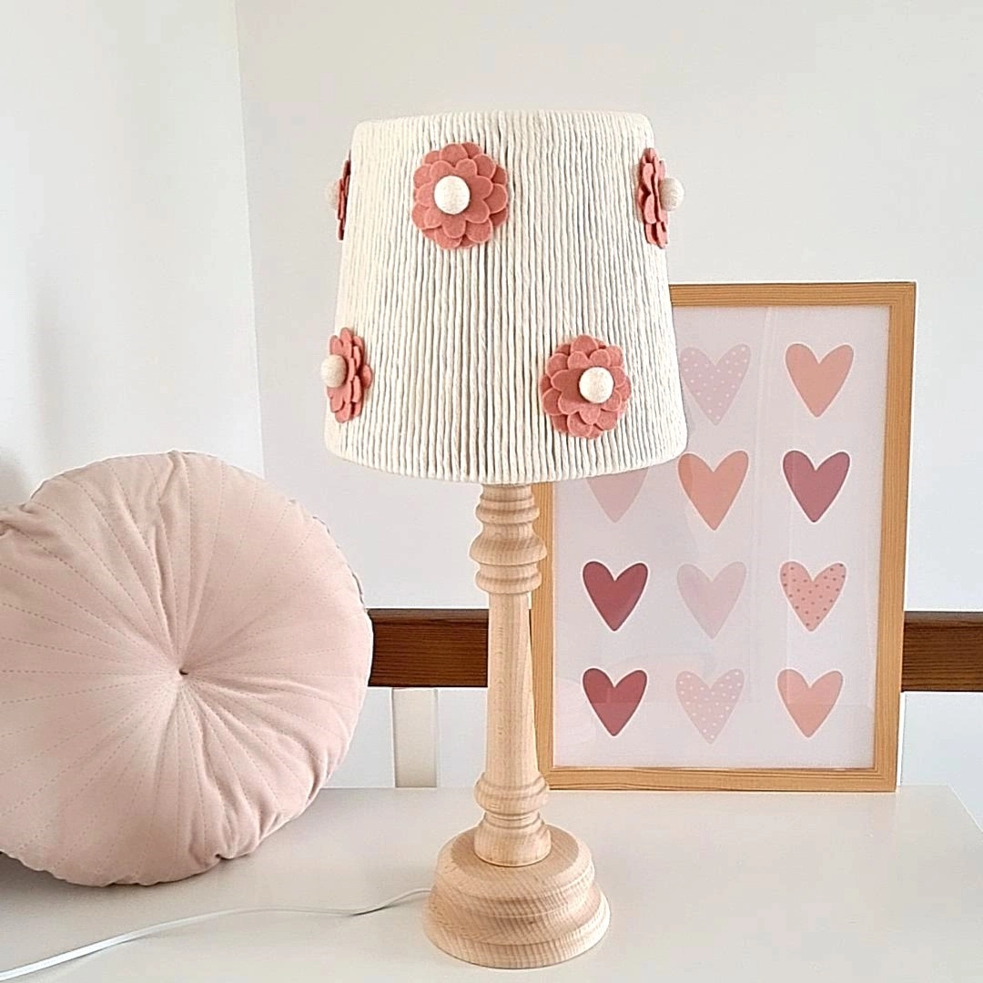 Feito à mão com cordão de algodão e delicadas flores de feltro, este candeeiro destaca-se pelo seu design suave e artesanal, que traz um charme único a qualquer espaço.