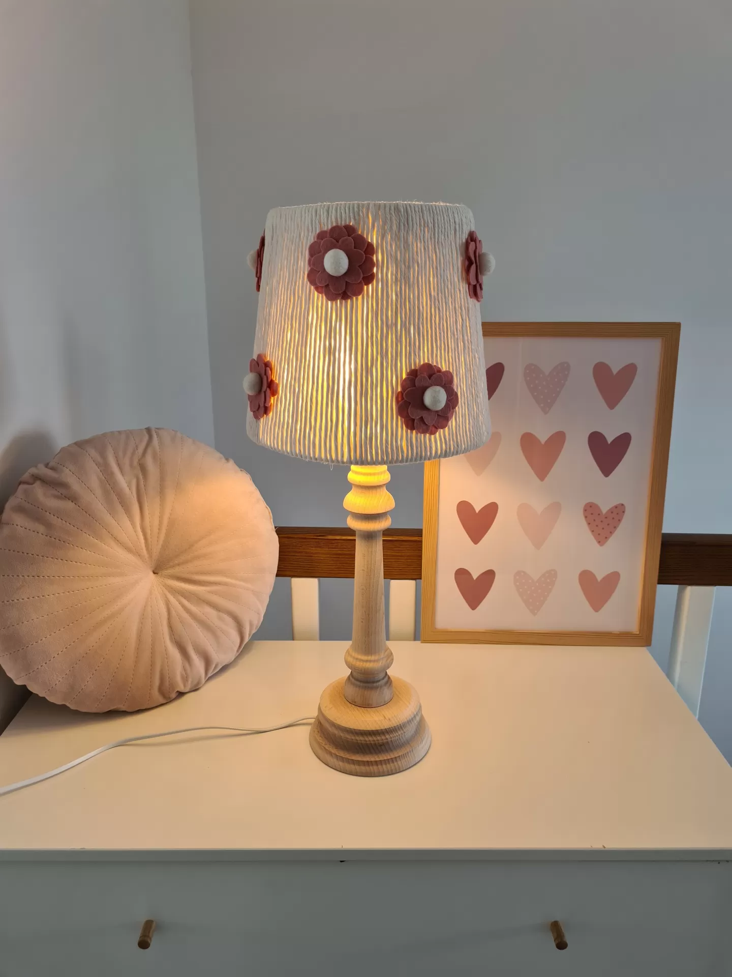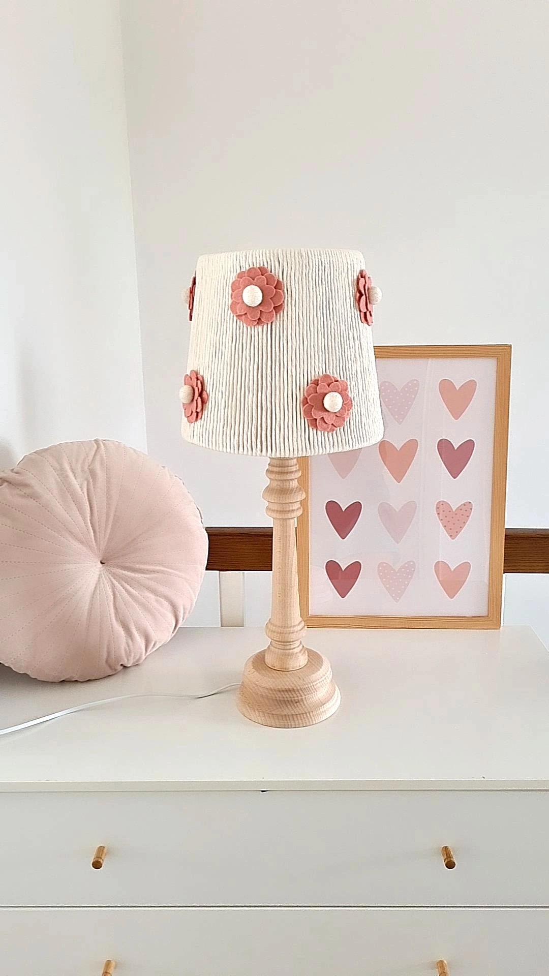 • Abajur com base em madeira e cúpula branca com flores cor de rosa sobre cómoda branca, com almofada redonda rosa e quadro de corações no fundo