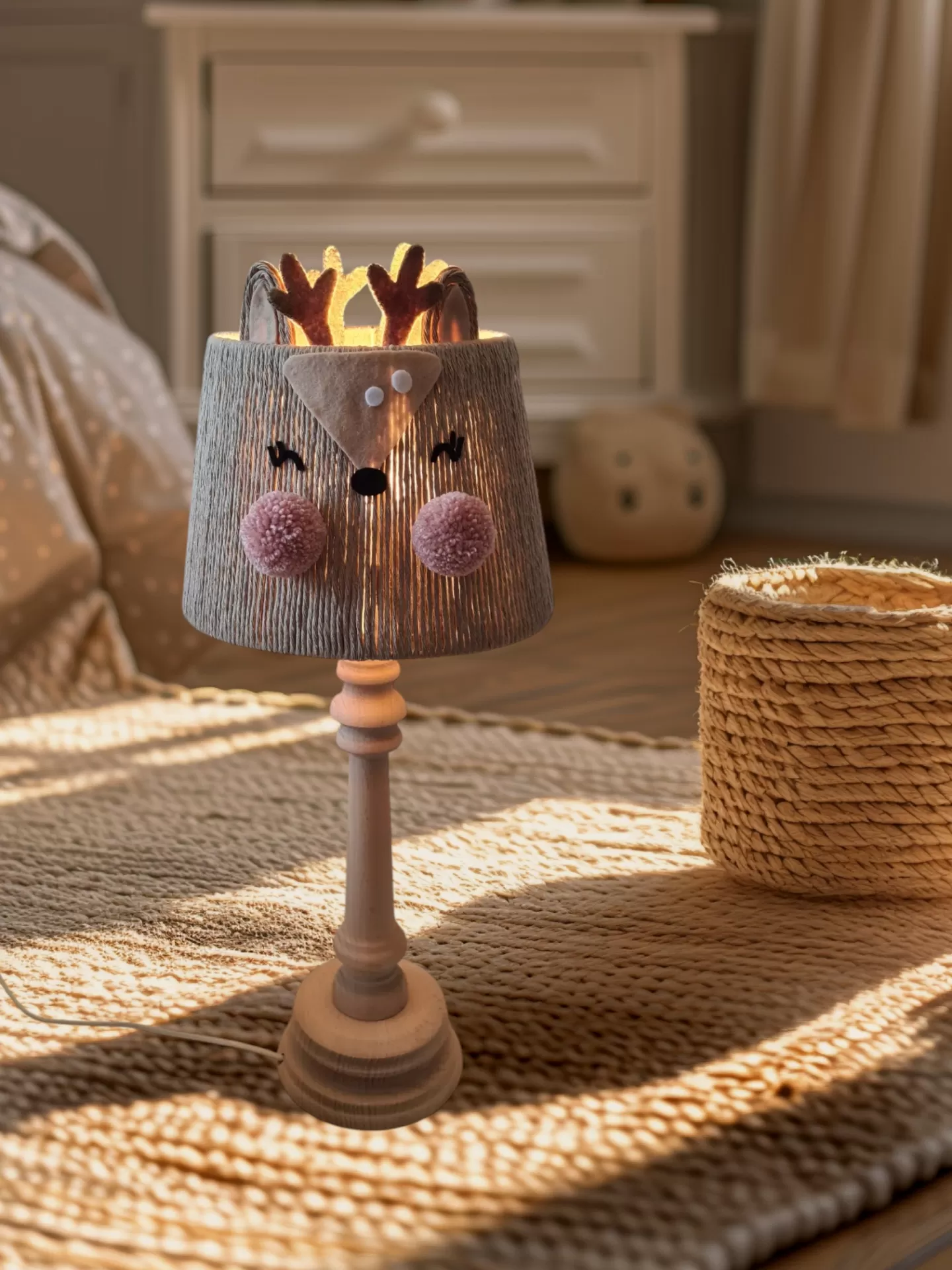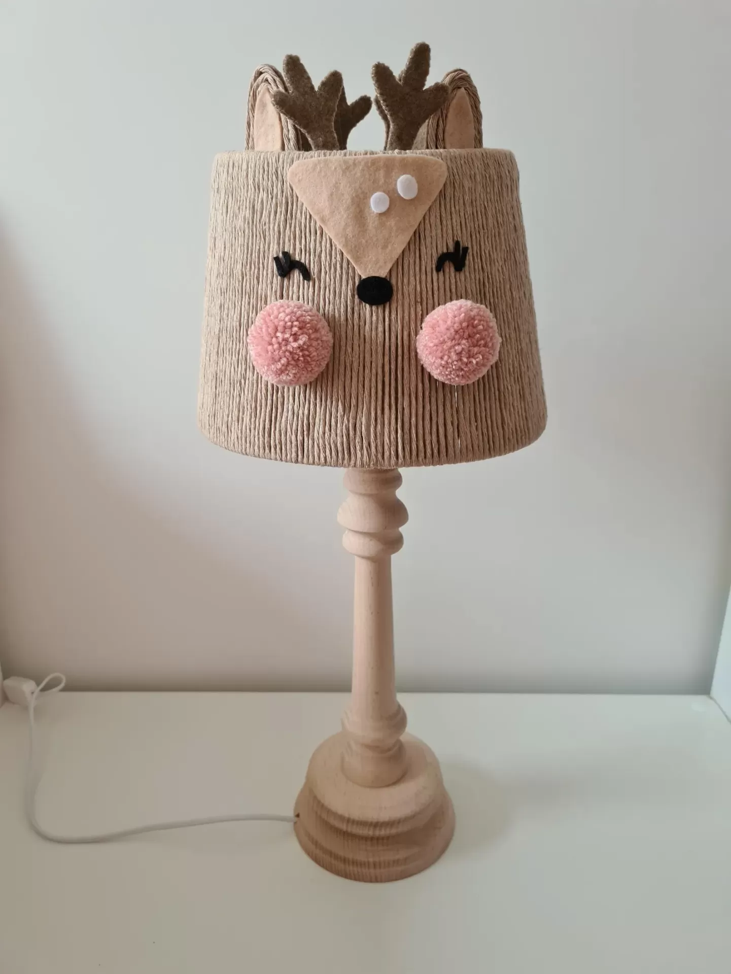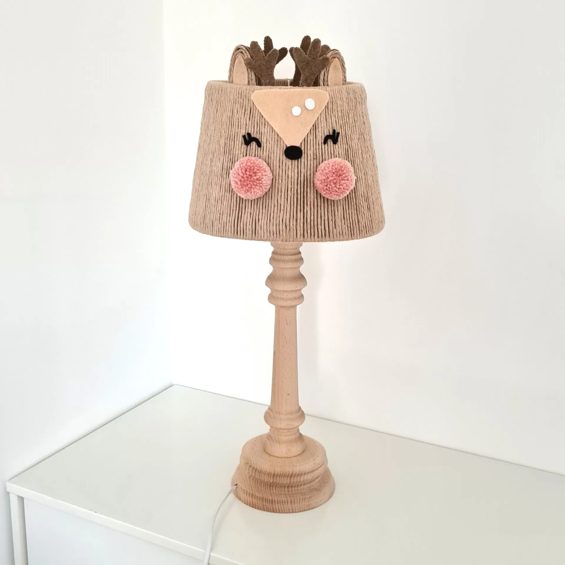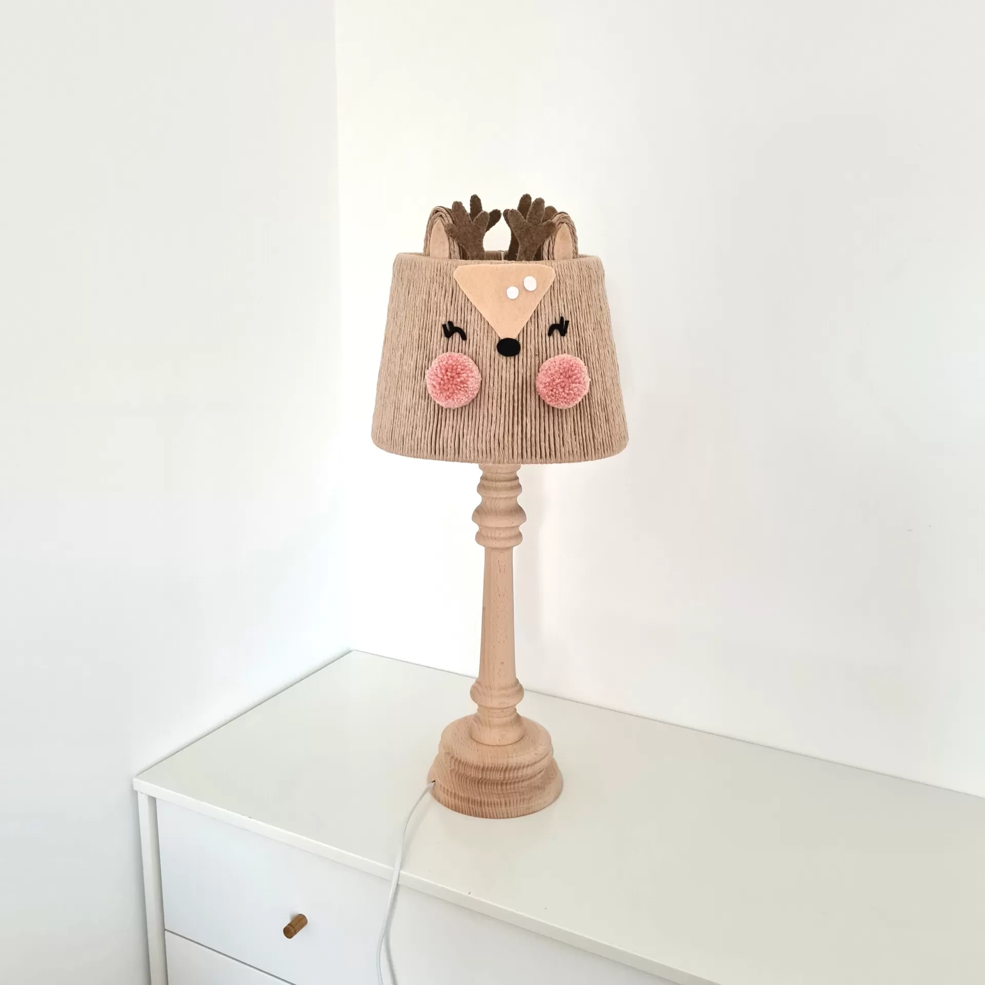 • Candeeiro de mesa com cúpula em forma de rena, madeira castanha clara e detalhes cor de rosa