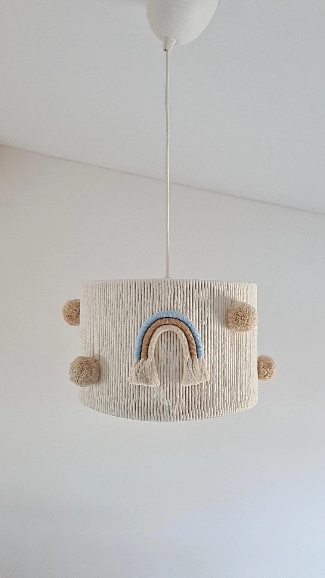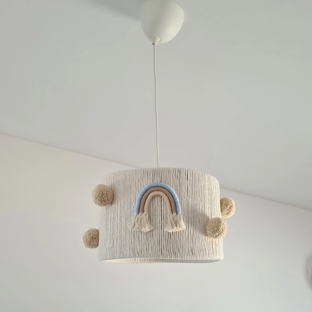 • Luminária de tecto bege com textura de corda, pompons e arco-íris azul e bege.