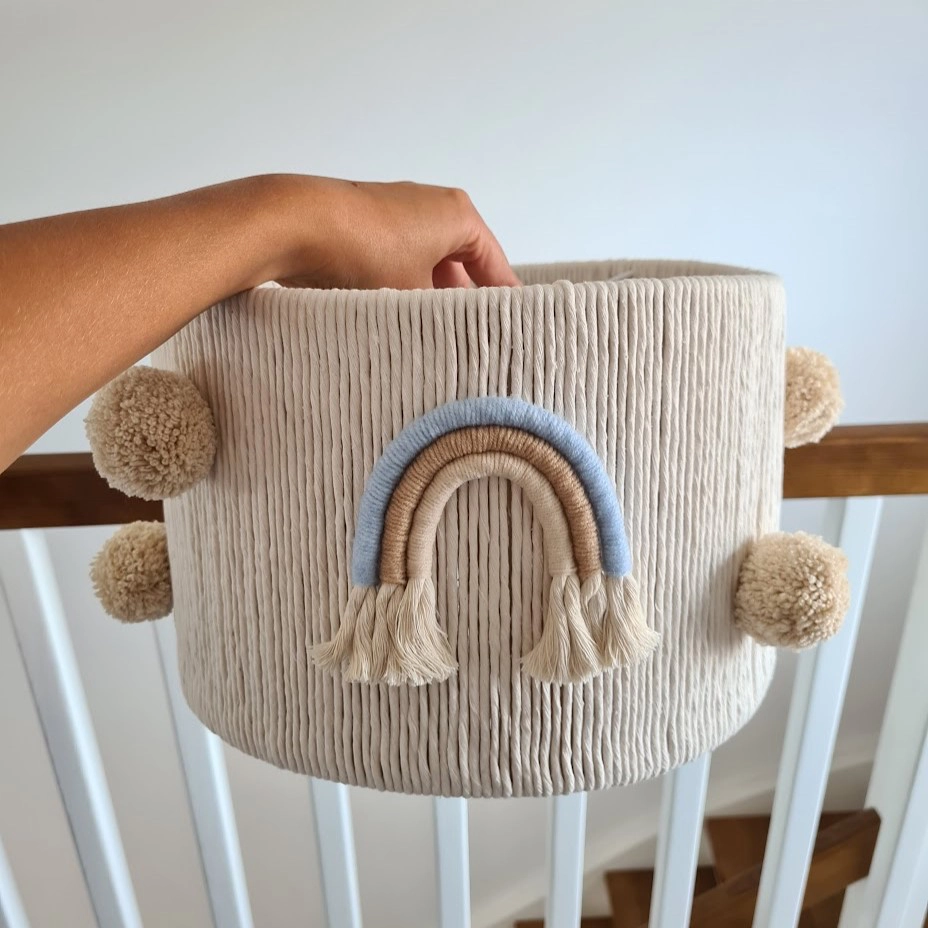 • Cesto de tecido cinzento claro com arco-íris decorativo e pompons