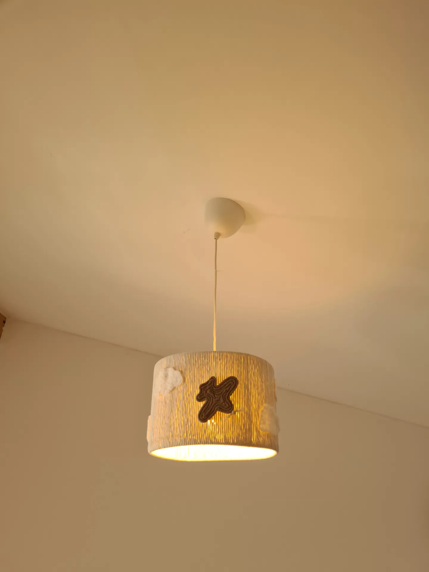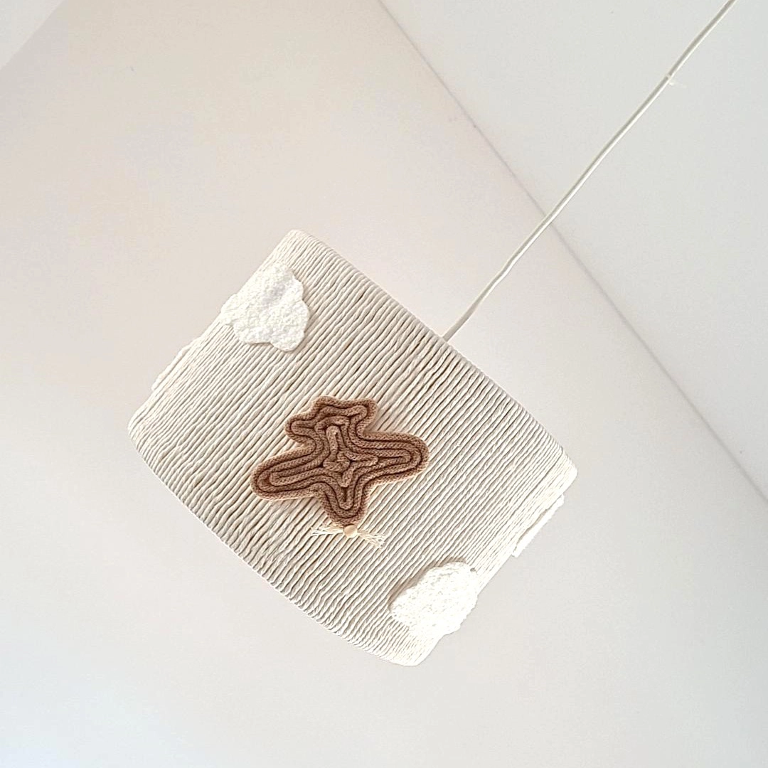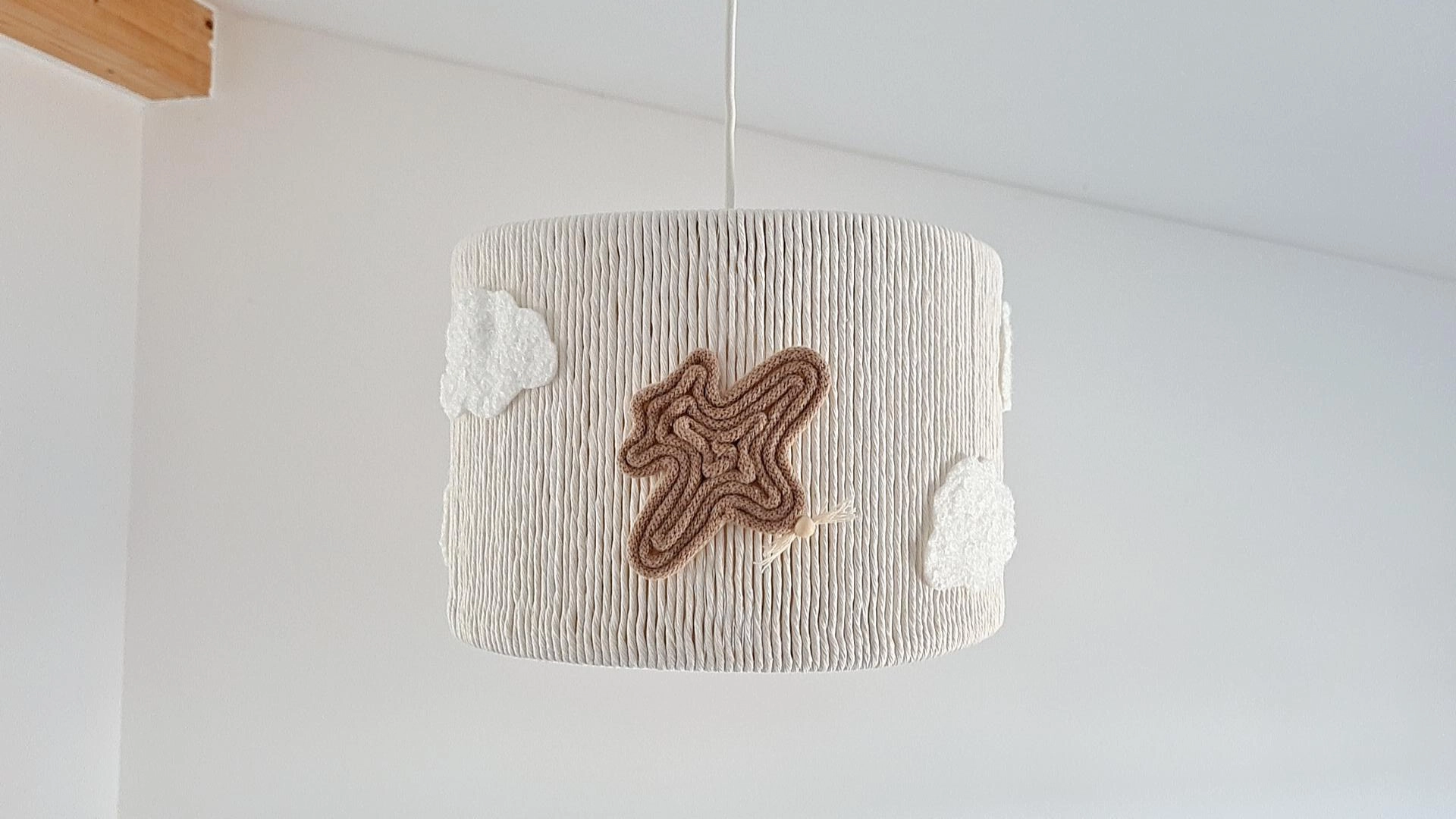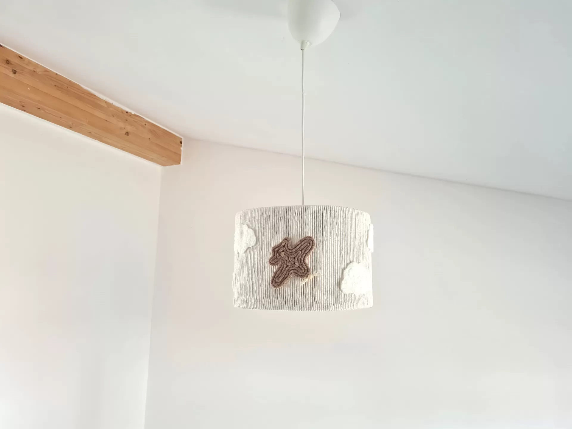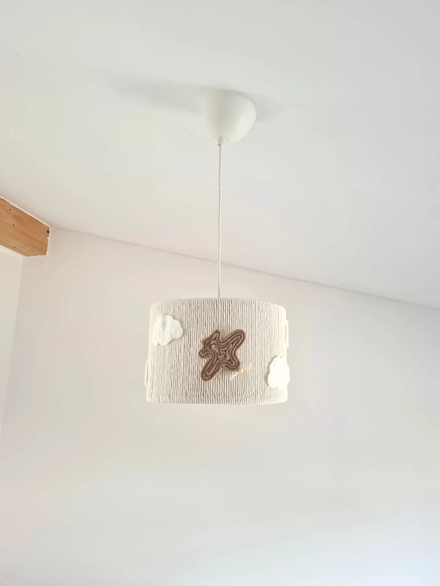 Este candeeiro de teto artesanal é uma peça encantadora e única, perfeita para iluminar e decorar qualquer quarto infantil.