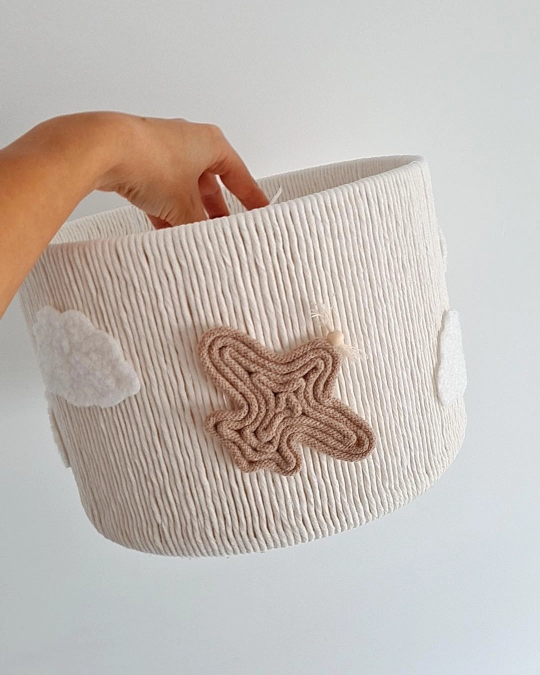• Cesto branco com aplicações de estrela e nuvens em feltro