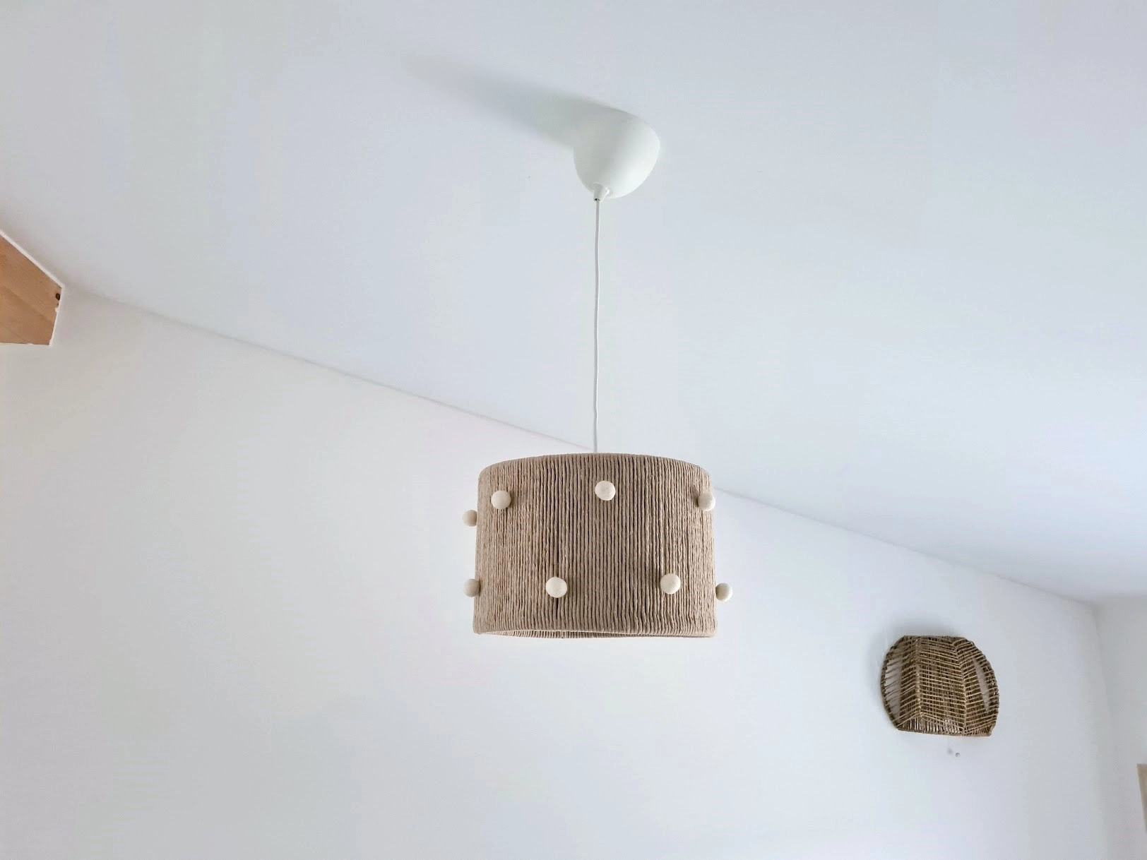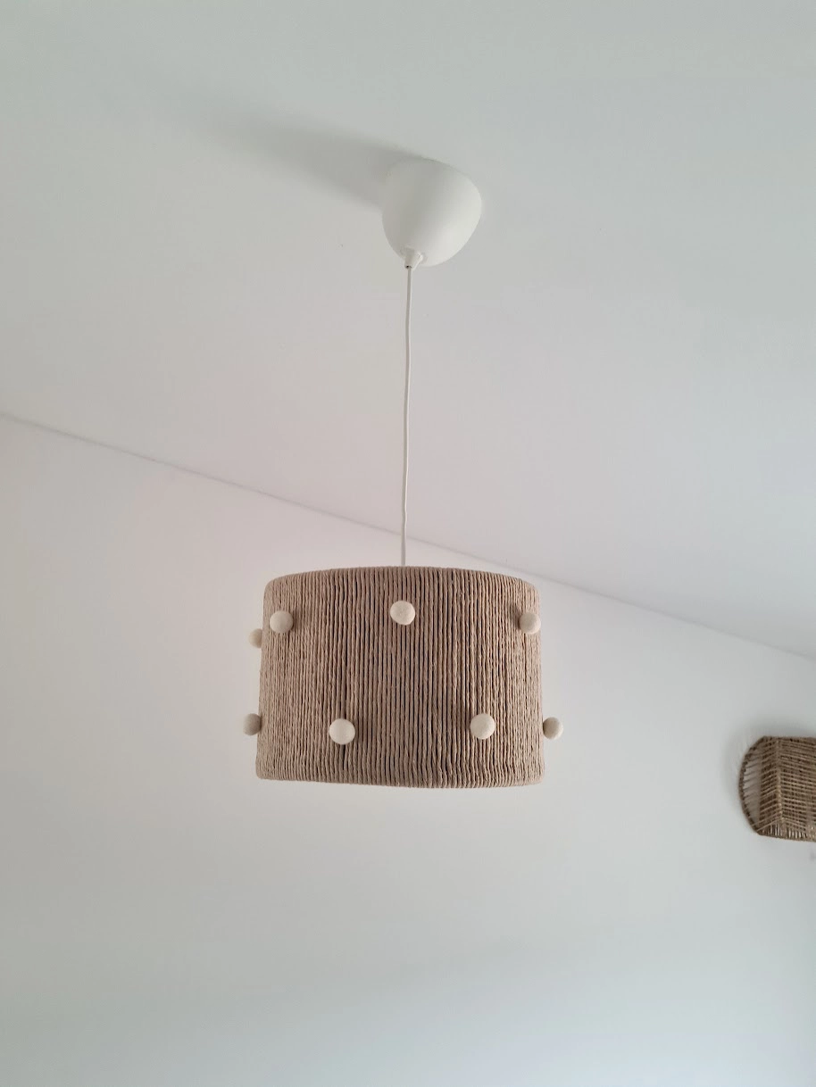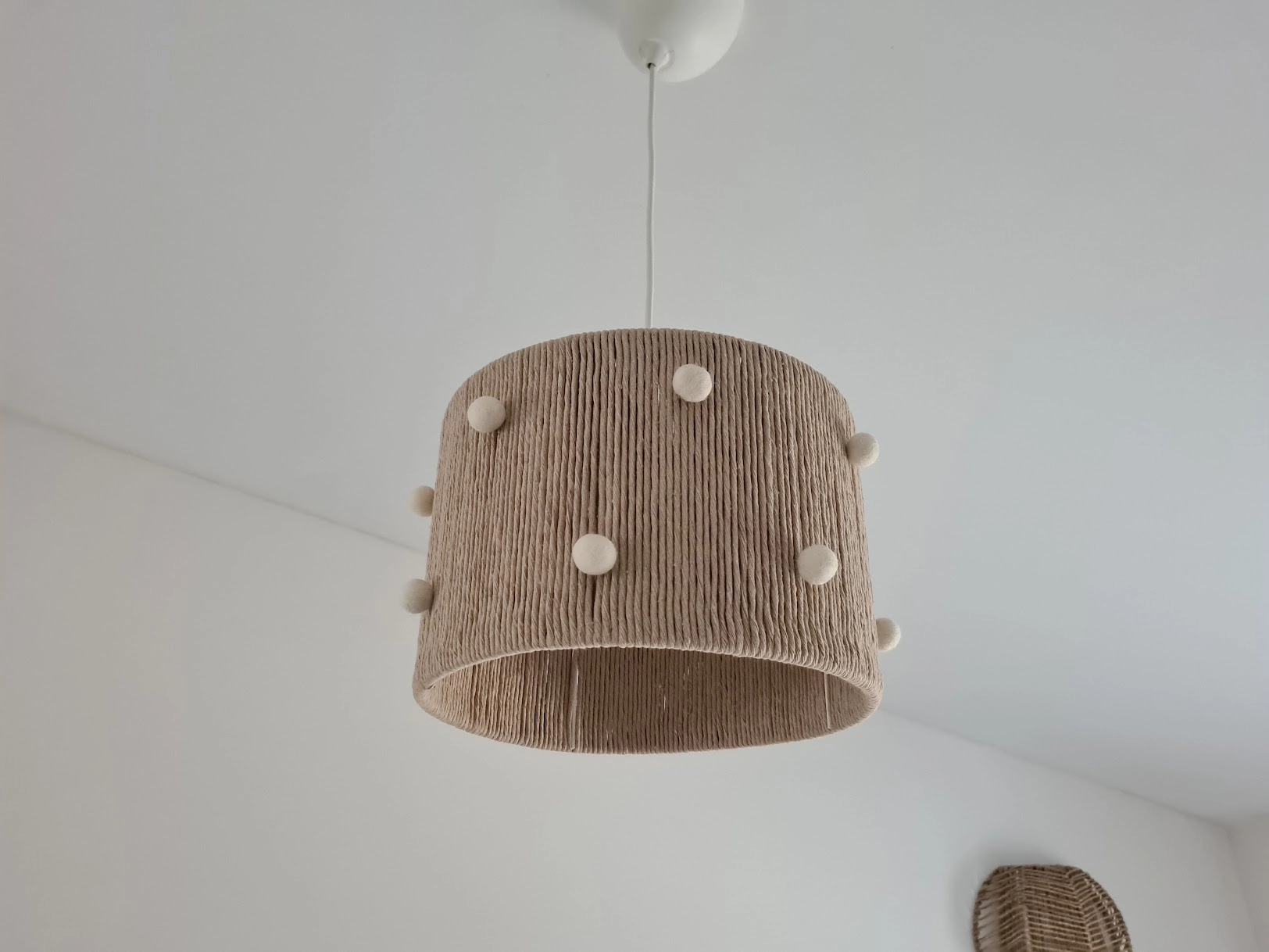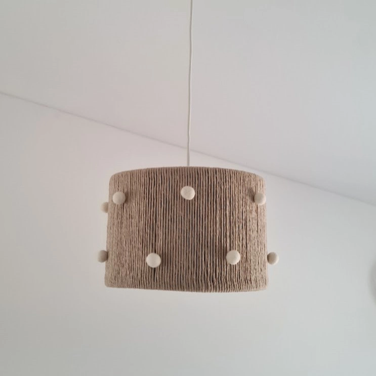 • Candeeiro de tecto em juta com pompons brancos pendurado