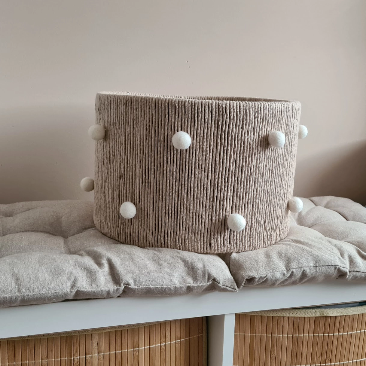 • Cesto redondo bege texturizado com bolinhas brancas sobre almofada numa estante branca com cestos de vime.