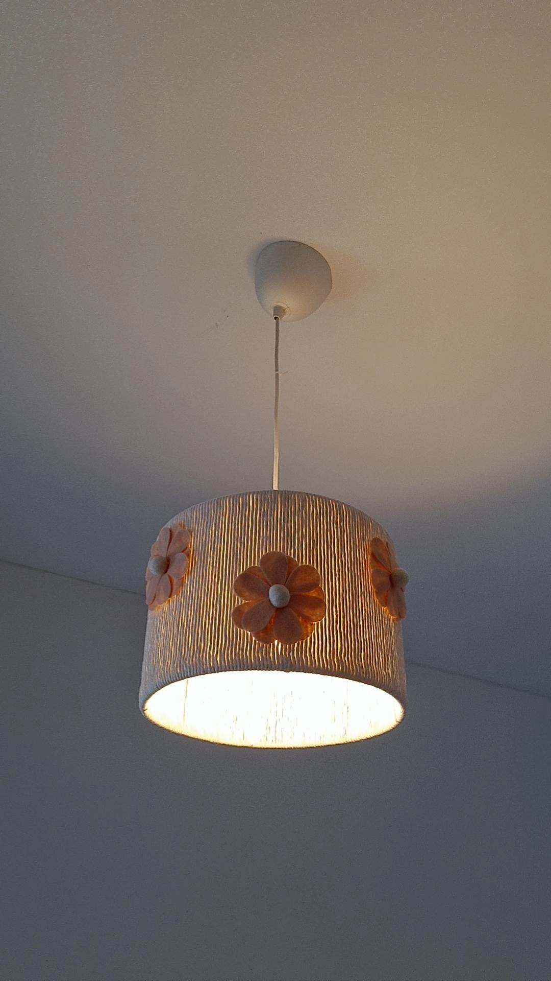 • luminária pendente tecido branco com flores cor de pêssego