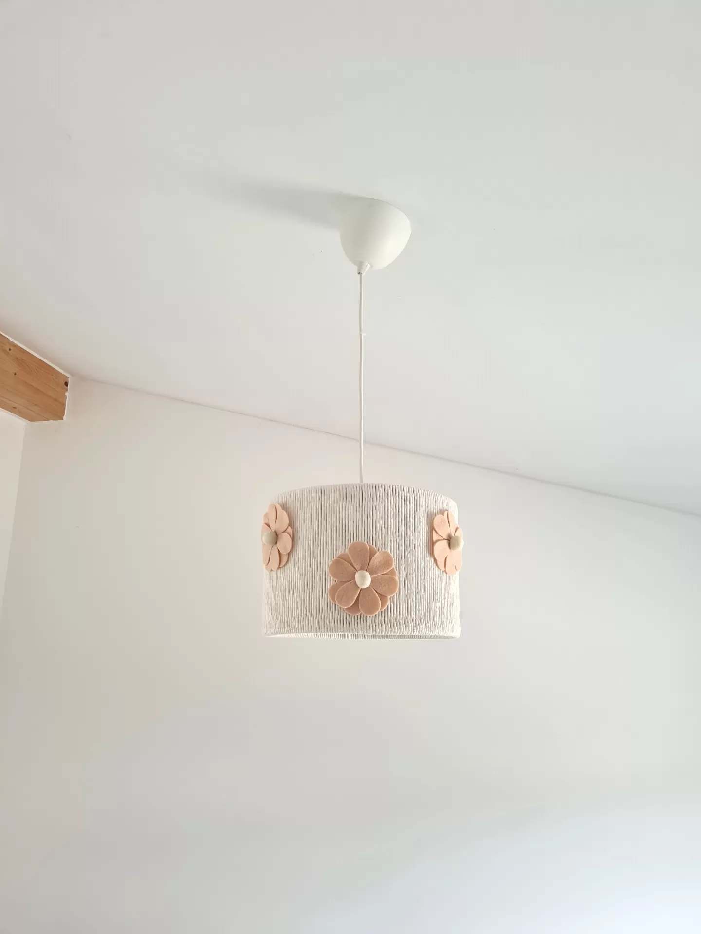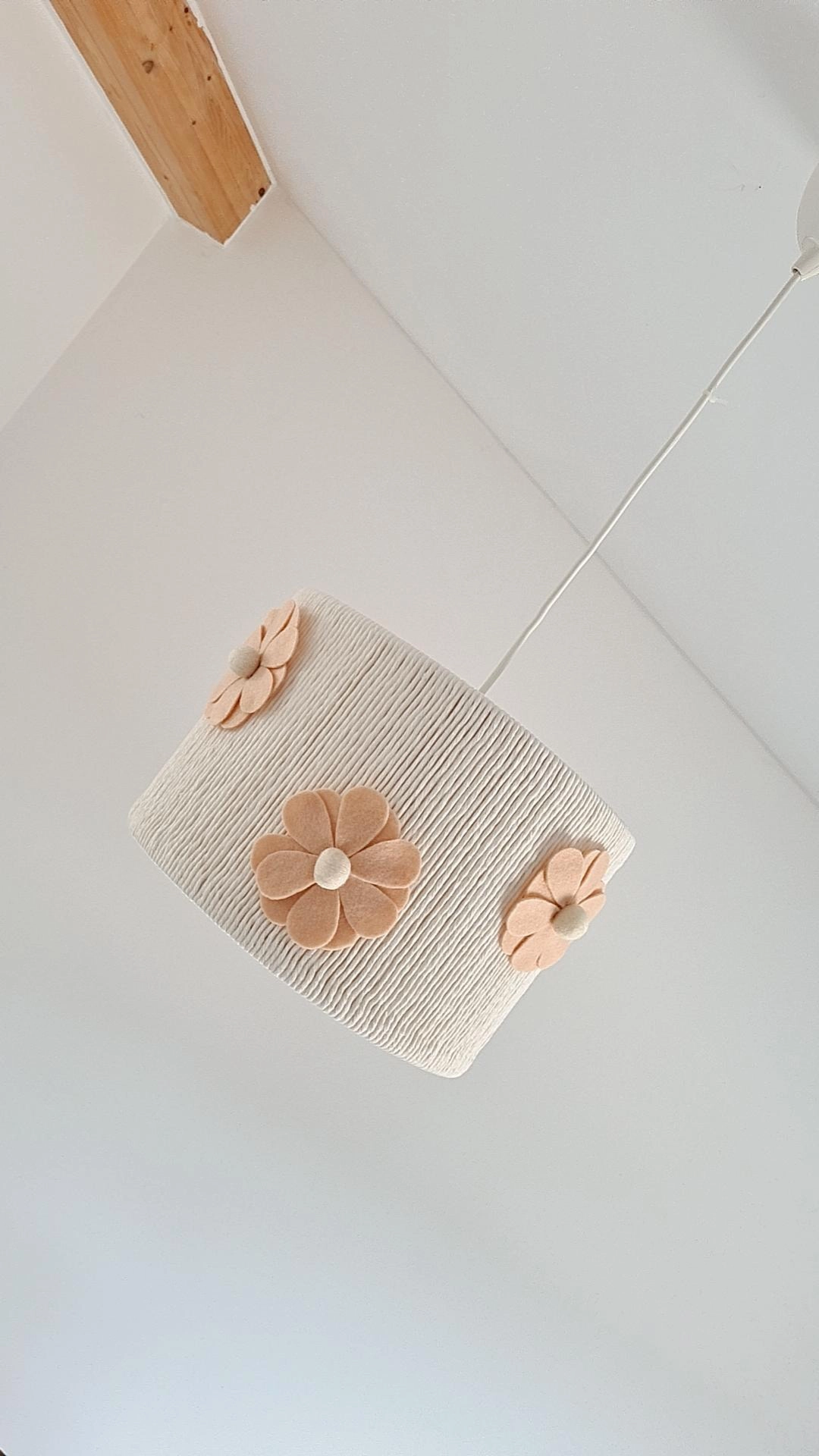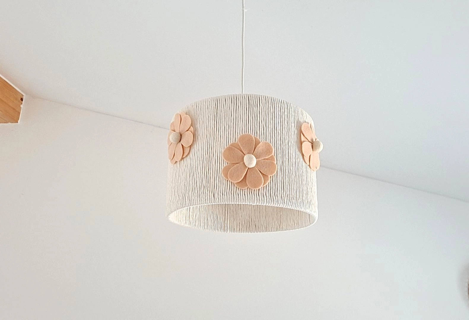 Luminária suspensa com abajur branco texturizado e flores bege em relevo Candeeiro de teto cilíndrico com flores decorativas em relevo Candeeiro de teto redondo branco com flores cor de pêssego decorativas Lâmpada de teto branca com flores castanhas suspensa num teto branco com viga de madeira Abajur suspenso com cúpula branca e flores decorativas bege luminária pendente tecido branco com flores cor de pêssego Luminária pendente branca com flores cor de rosa claro em tecido, segurada por mão vestindo camisola rosa
