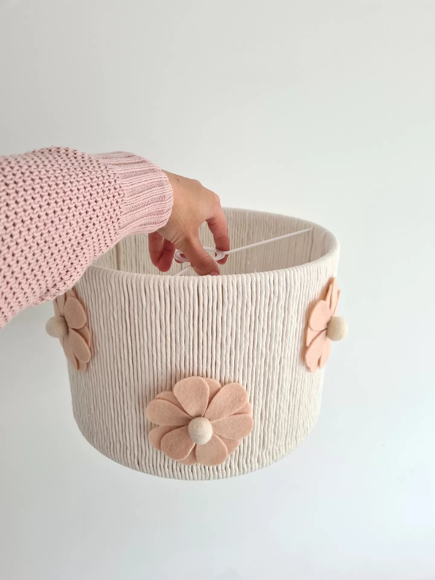 • Luminária pendente branca com flores cor de rosa claro em tecido, segurada por mão vestindo camisola rosa