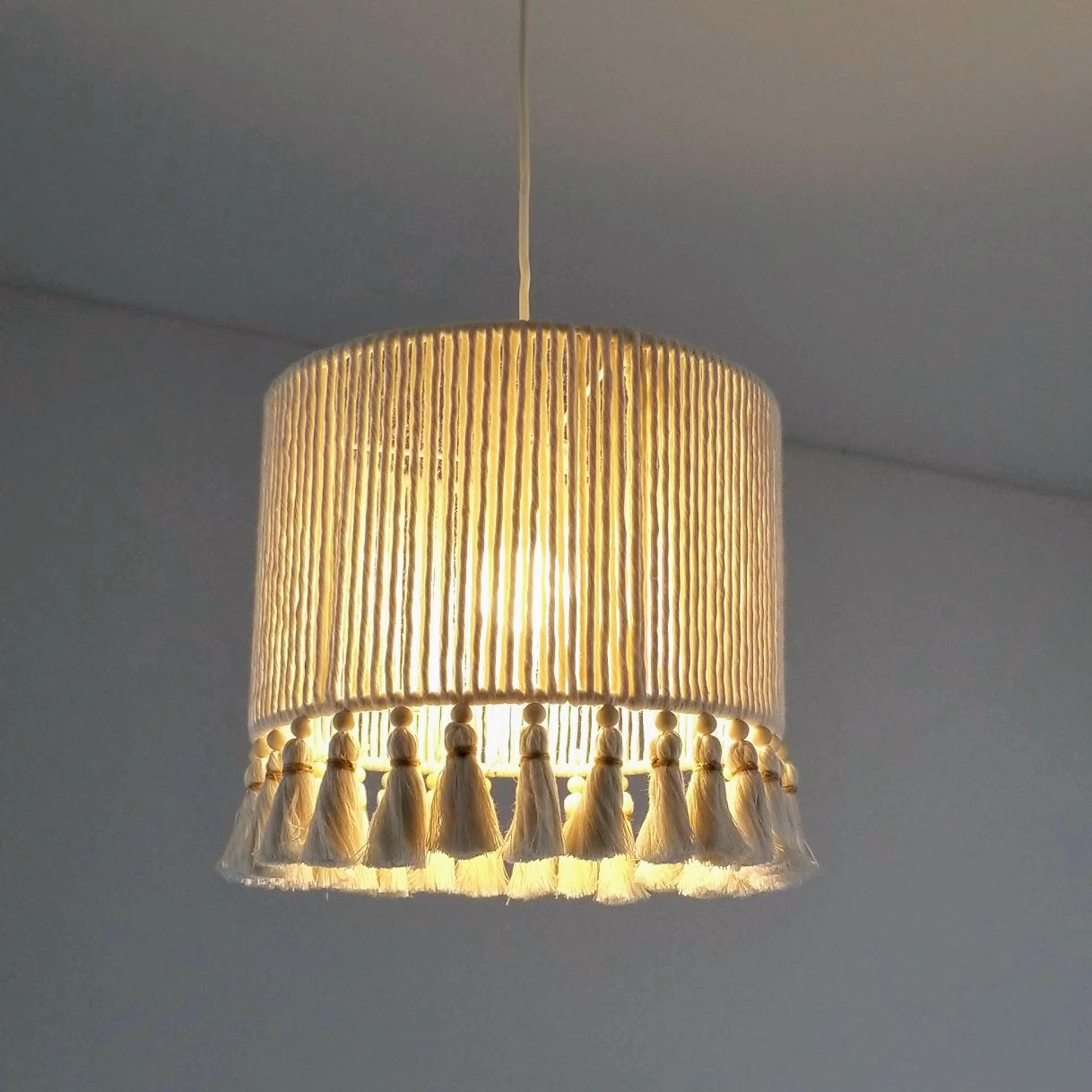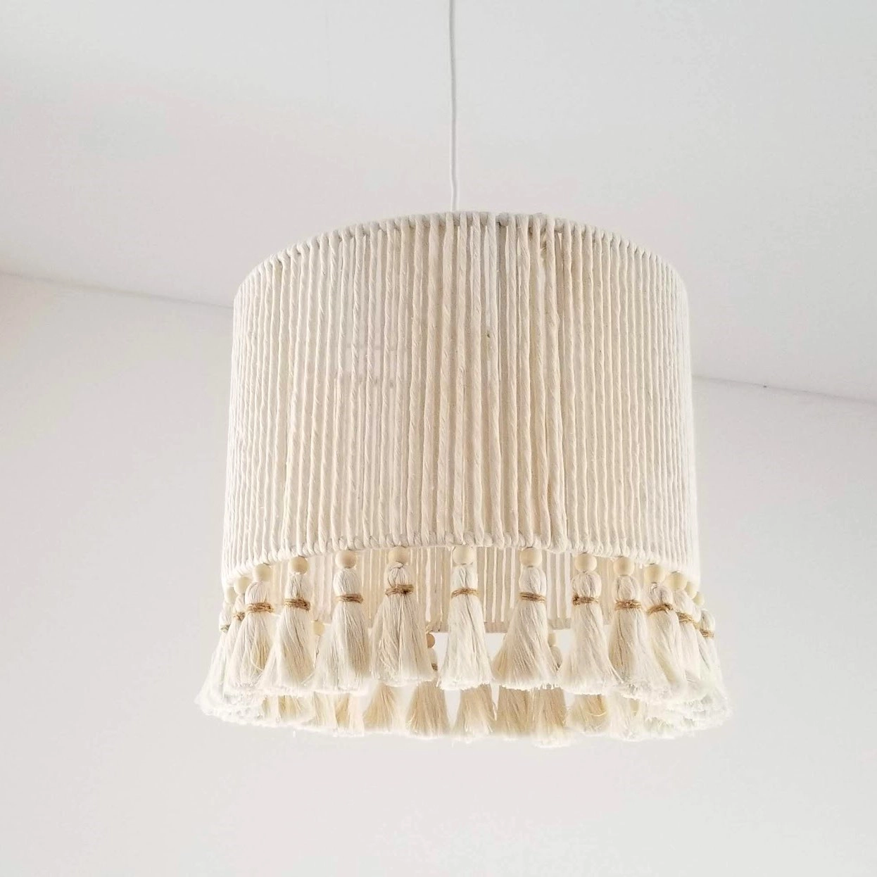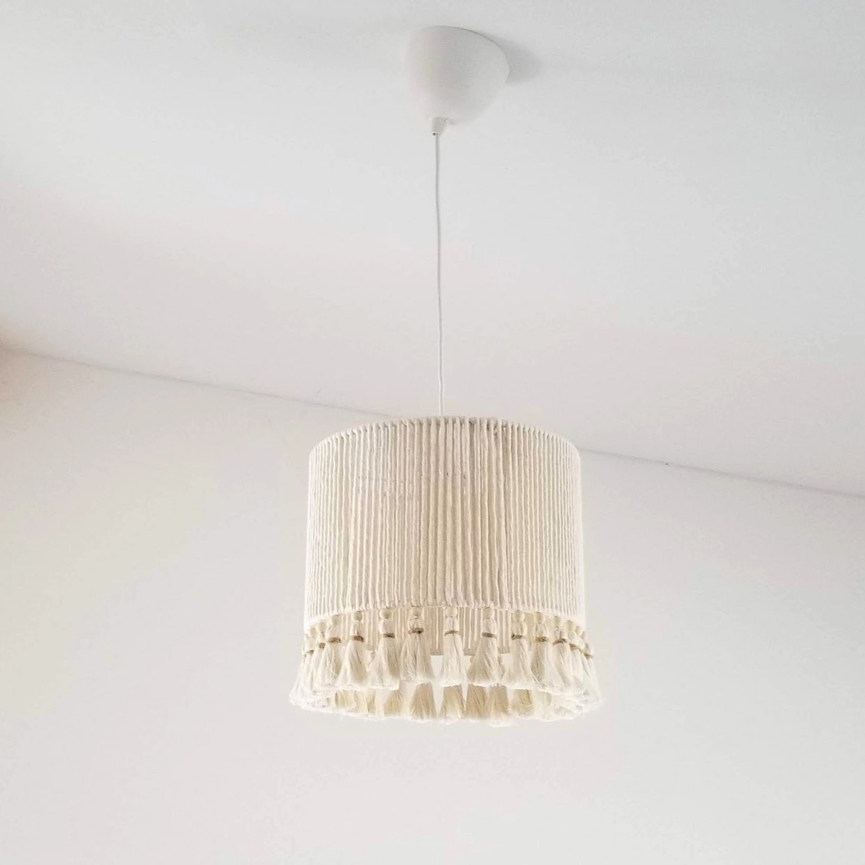 • Candeeiro de teto com cúpula de tecido branco e franjas tassel