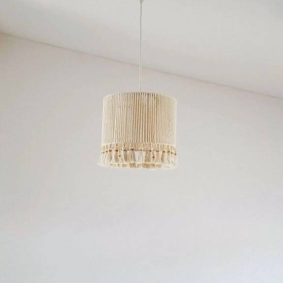 • Candeeiro de teto pendente com cúpula cilíndrica em tecido branco com franja decorativa