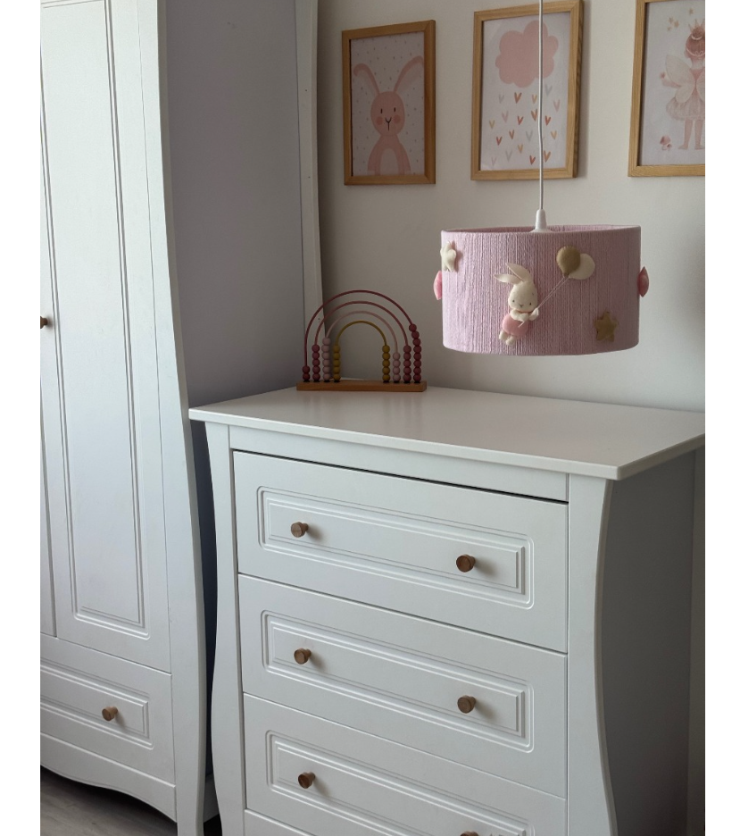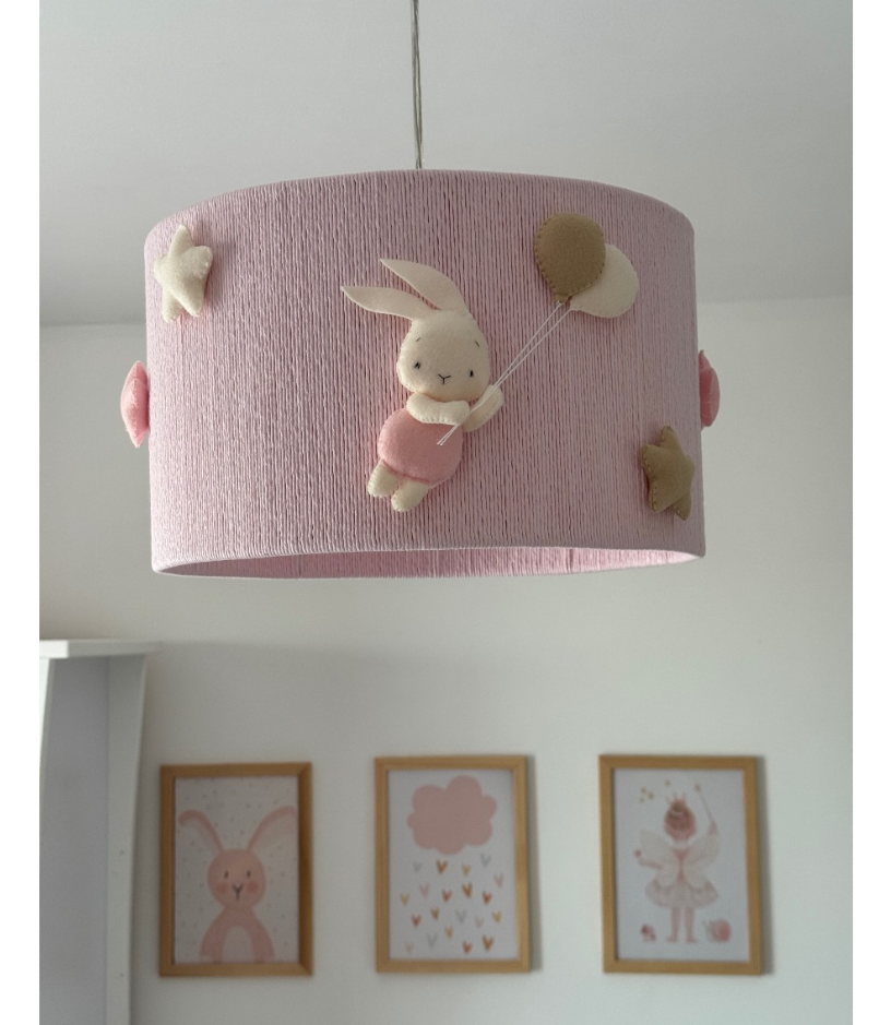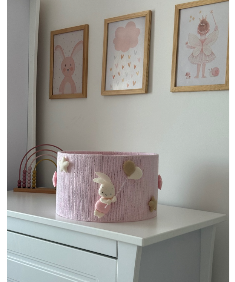 Com aprox. 20 cm de altura e 35 cm de diâmetro, o modelo em tom rosa é adornado com coelhinhos de feltro, balões e estrelas, enchendo o ambiente de encanto, aconchego e imaginação.