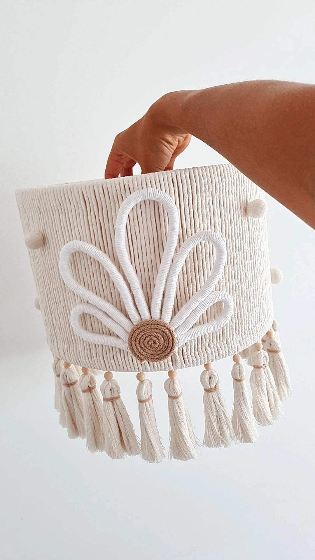 Confeccionado à mão com corda de algodão cru de alta qualidade, fios brancos e feltro de lã polonês, ele une beleza natural, texturas aconchegantes e um design que convida à imaginação.
