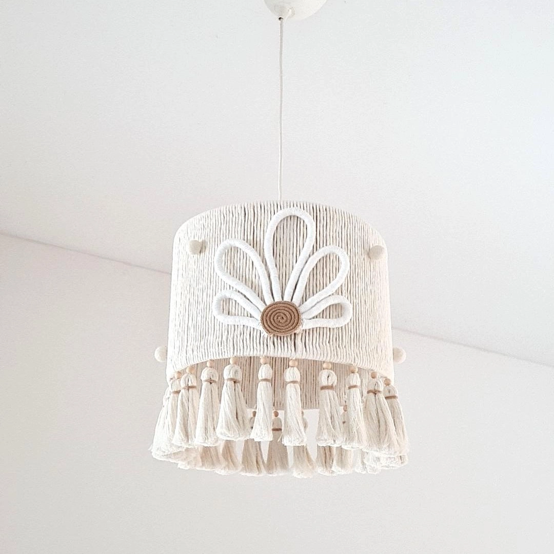 Abajur de tecido creme com padrão floral em cordas e franjas penduradas Candeeiro de tecto de tecido branco com padrão floral e pompons pendurados Candeeiro suspenso branco com padrão floral e franjas no abajur cylindrical Candeeiro de tecto pendente bege com padrão floral e franjas Candeeiro pendente em tecido natural creme com padrão floral e franjas Candeeiro de teto branco com padrão floral e franjas