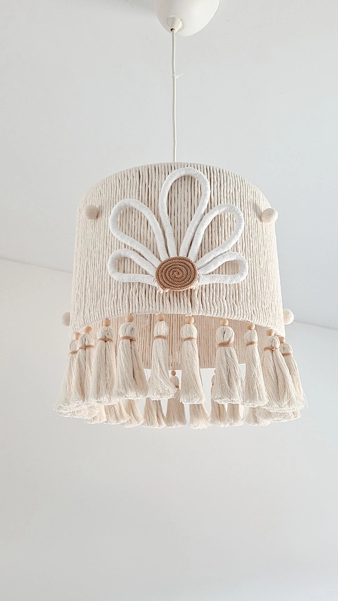 Decorado com duas conchas em feltro (uma de cada lado), bolinhas de lã e delicadas franjas de algodão, este abajur pendente em estilo boho é perfeito para trazer suavidade e originalidade ao quarto de meninas, meninos ou à sala de brincadeiras.
