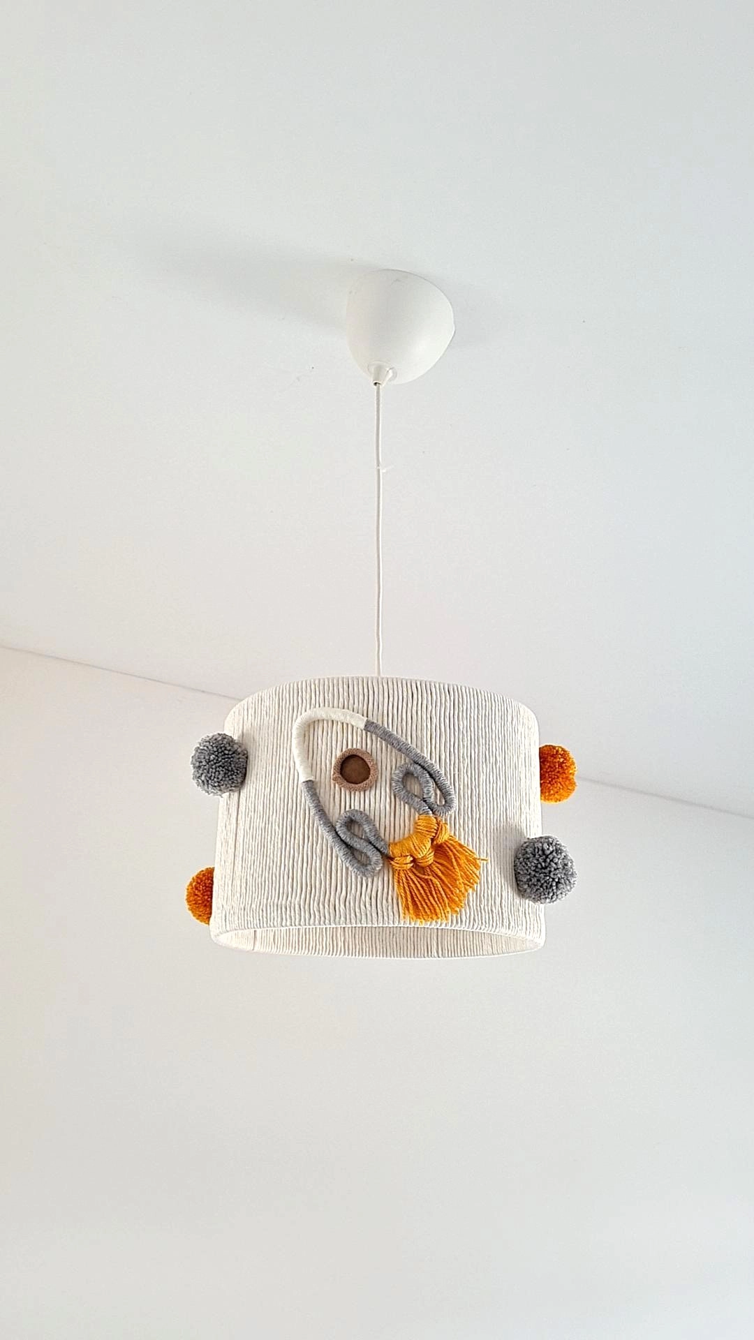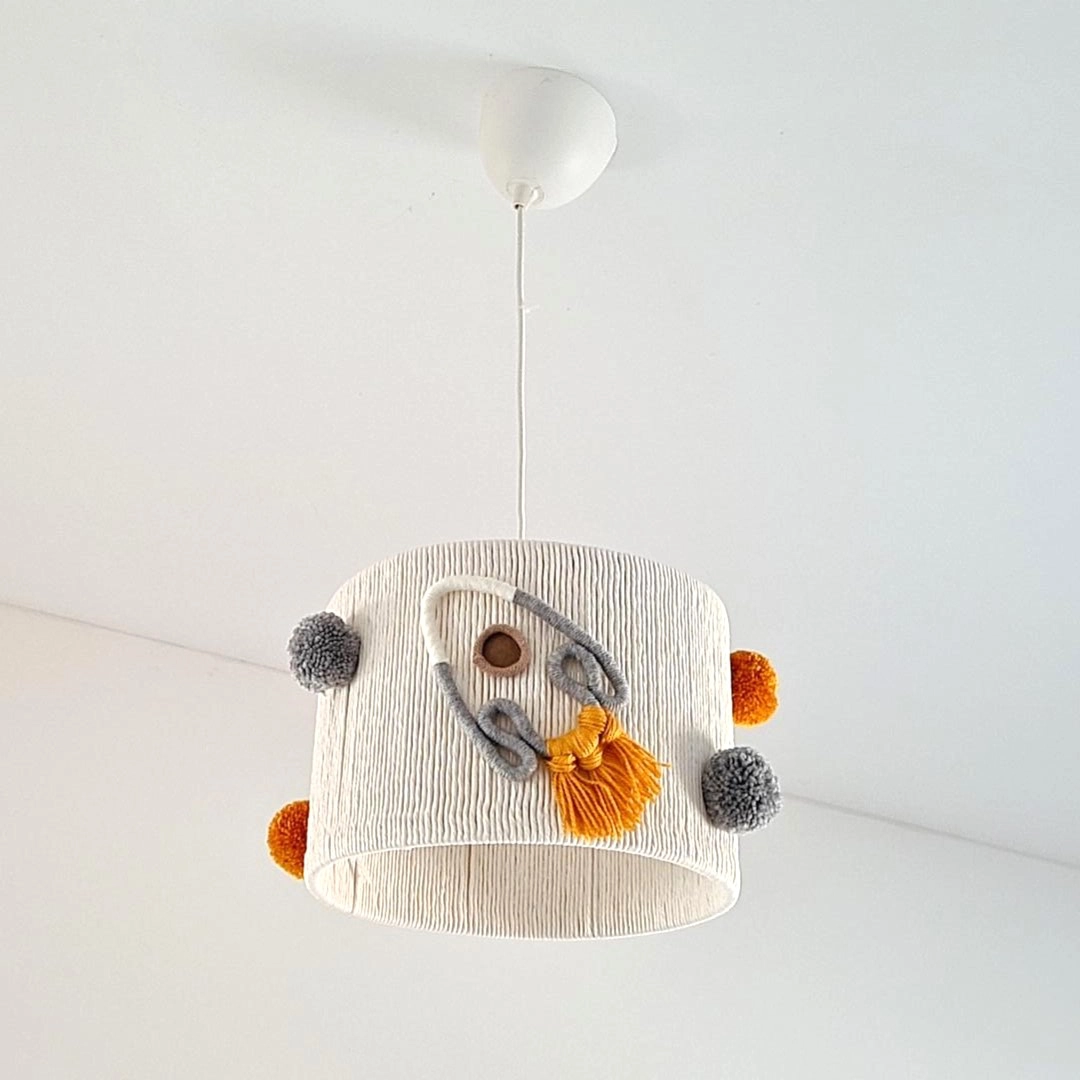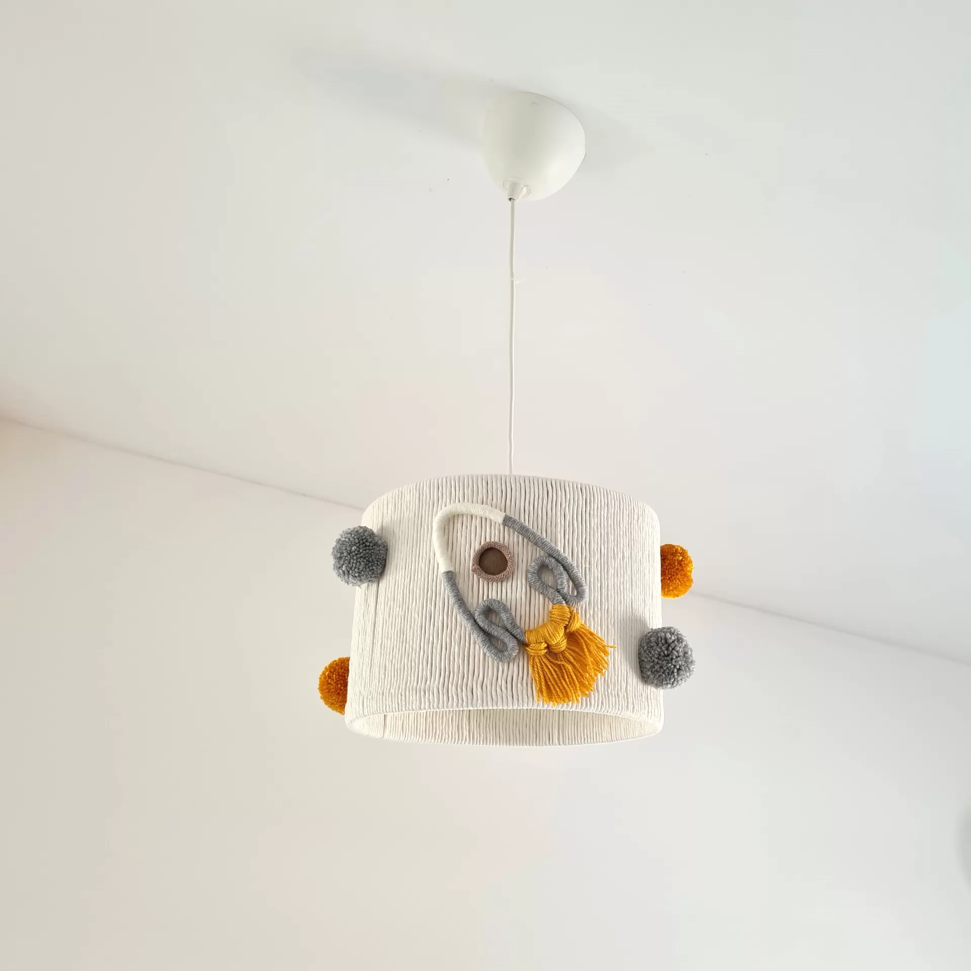 • Candeeiro de teto branco com pompons amarelos e cinza em tecido texturado