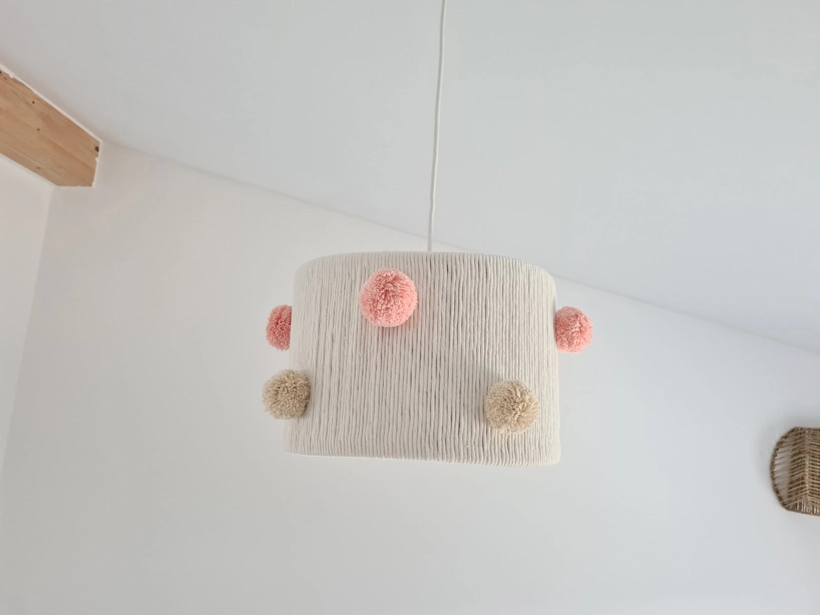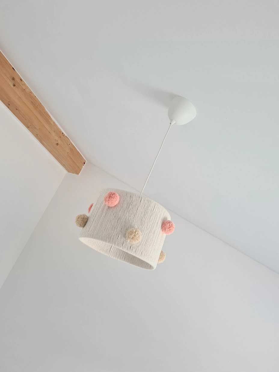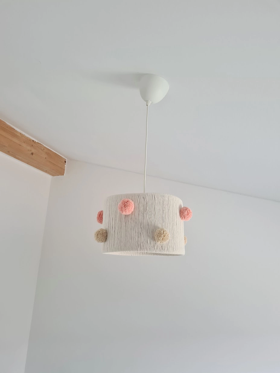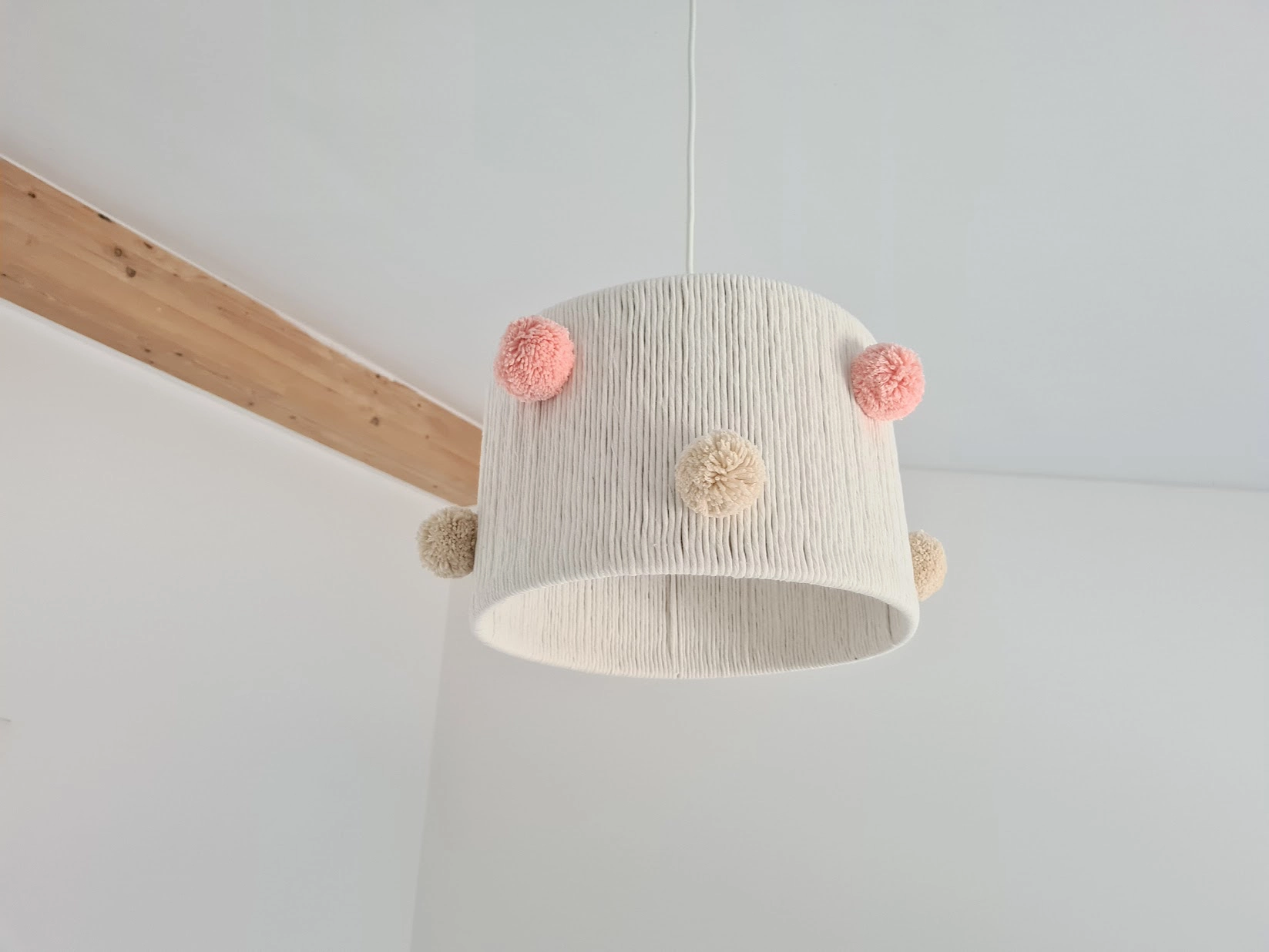 Candeeiro de teto em tecido cru com pompons cor-de-rosa e bege Abajur de teto com cúpula bege e pompons coloridos num teto branco Candeeiro de tecto com abajur branco e pompons coloridos Candeeiro de teto pendente branco com pompons coloridos, em ambiente interior com parede branca e vigas de madeira Cesto redondo em tecido bege com pompons rosa e bege segurado à frente de parede com quadros Quarto infantil com mobiliário em madeira clara, candeeiro com pompons e brinquedos de peluche