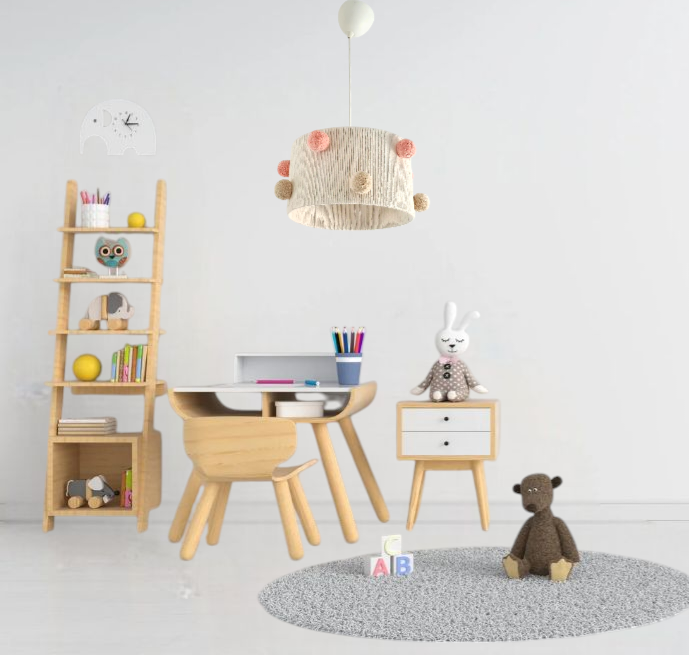 • Quarto infantil com mobiliário em madeira clara, candeeiro com pompons e brinquedos de peluche