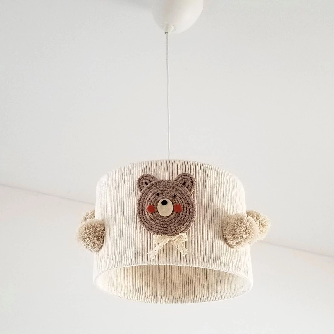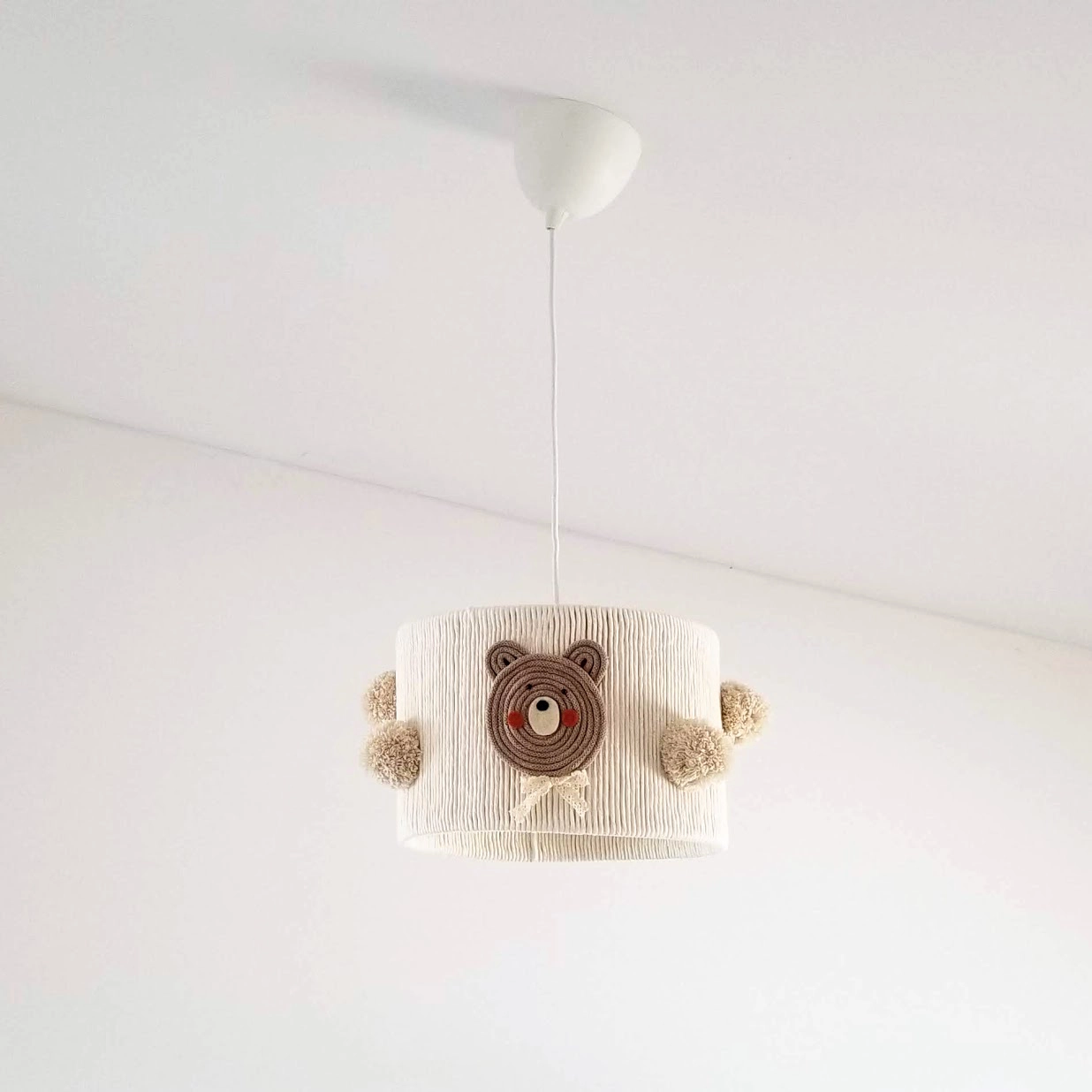 • Abajur de teto creme com rosto de urso em feltro castanho e pompons castanhos