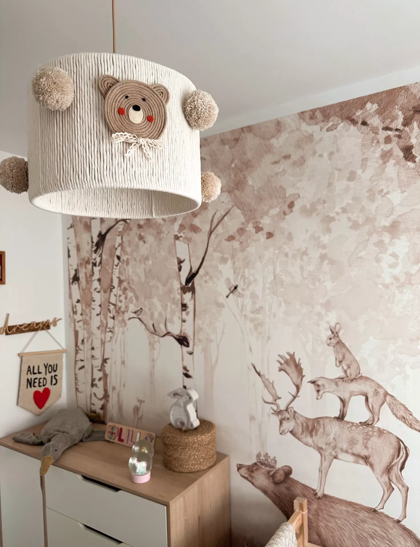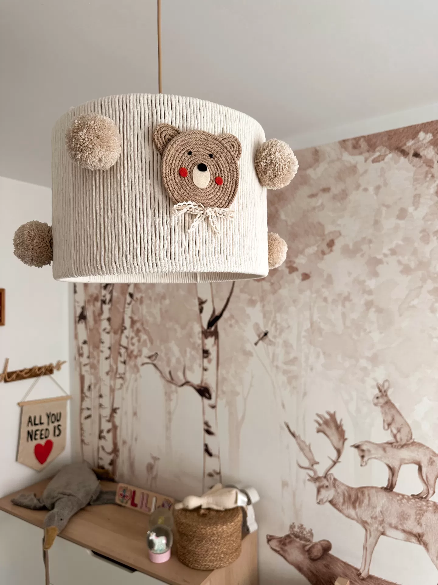• Candeeiro infantil bege com urso em croché e pompons, mural de animais da floresta ao fundo