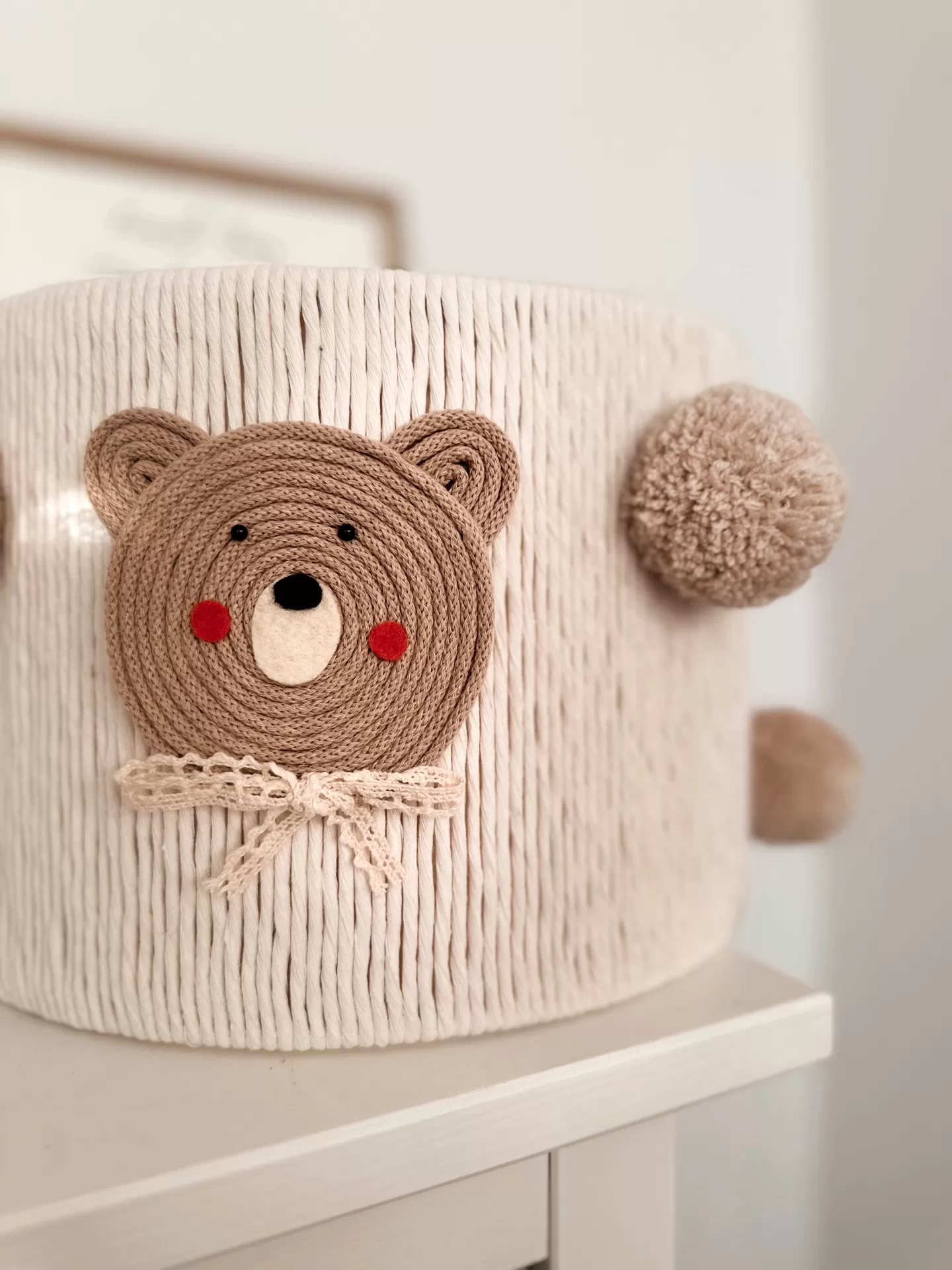 • Cesto branco redondo decorado com rosto de urso em corda castanha e pompons castanhos