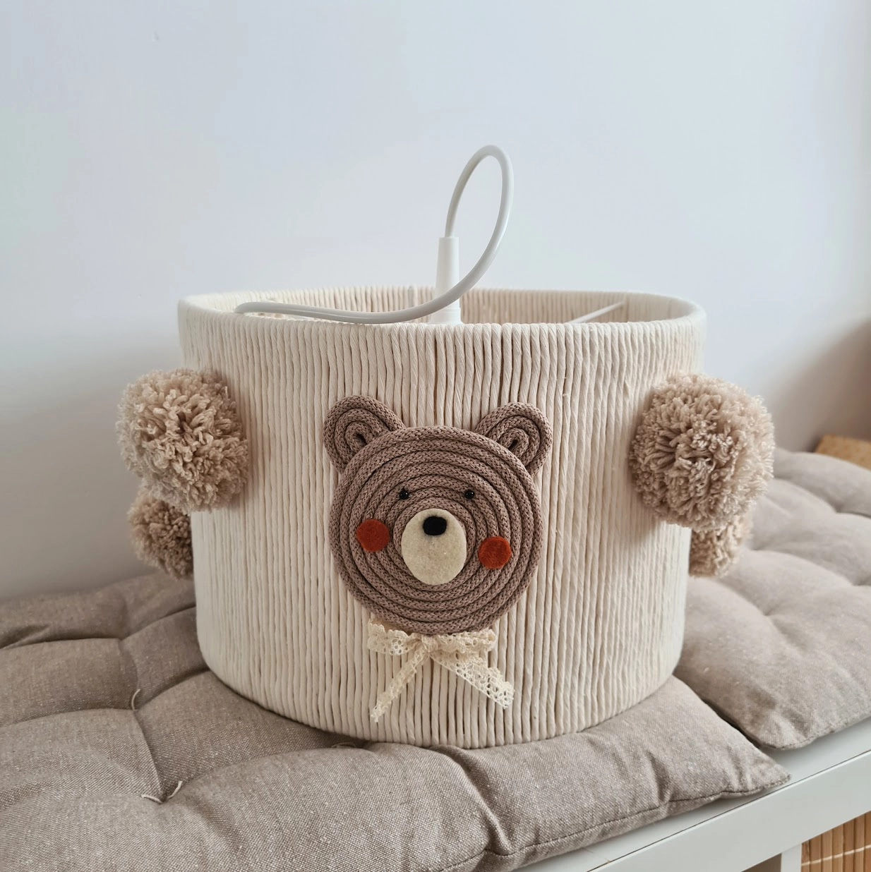 • Candeeiro de teto infantil creme com rosto de urso em crochet e pompons laterais