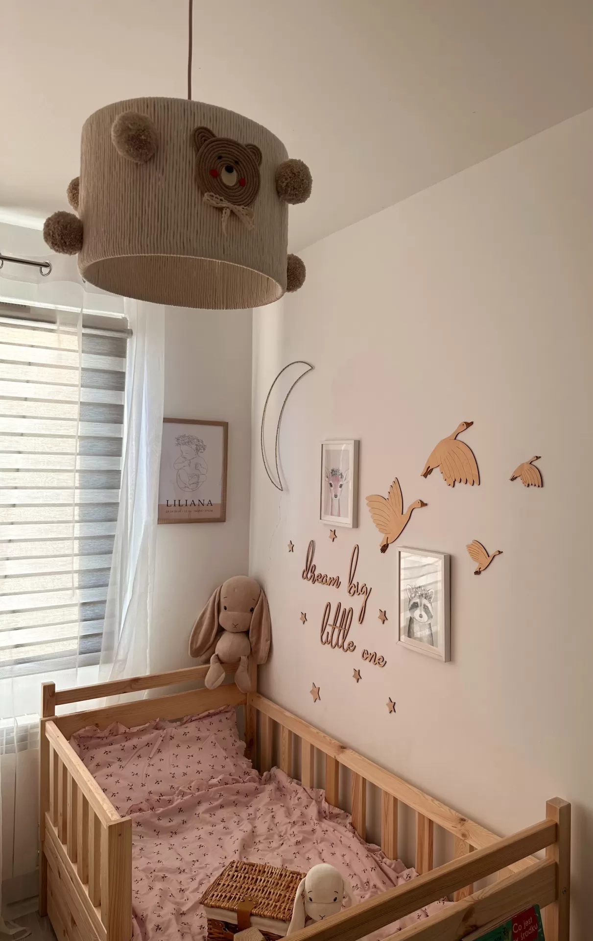 • Quarto de bebé com berço de madeira, roupa de cama rosa, abajur com urso e decoração de parede com pássaros