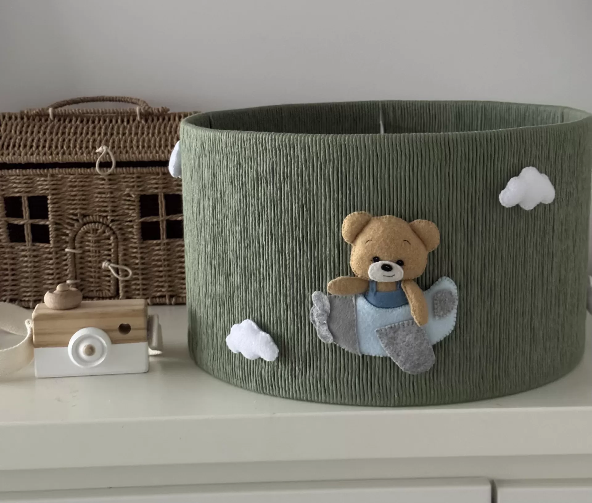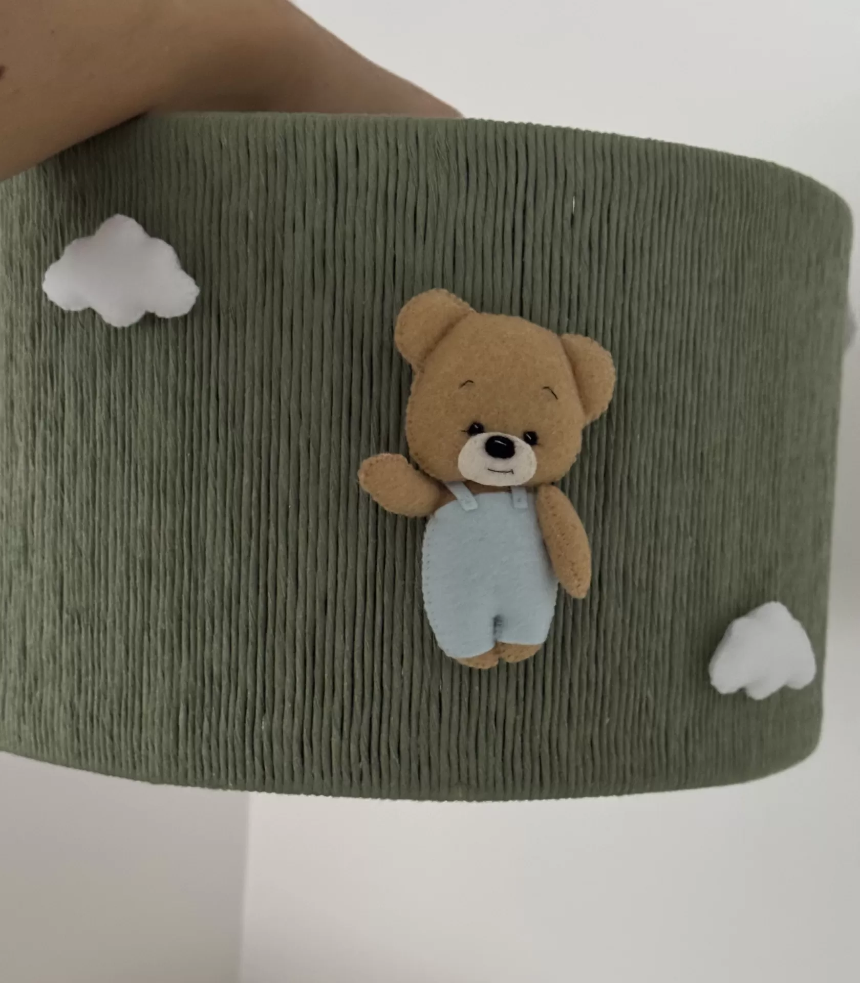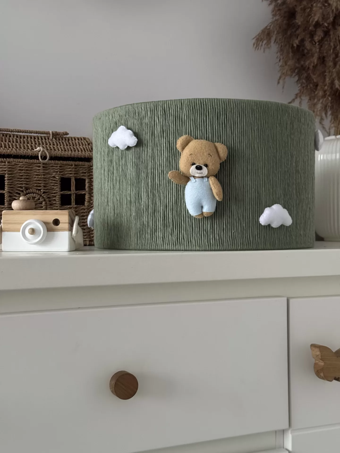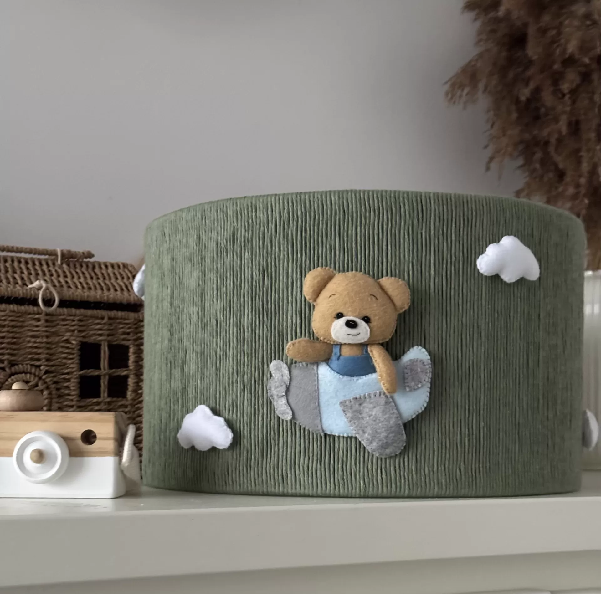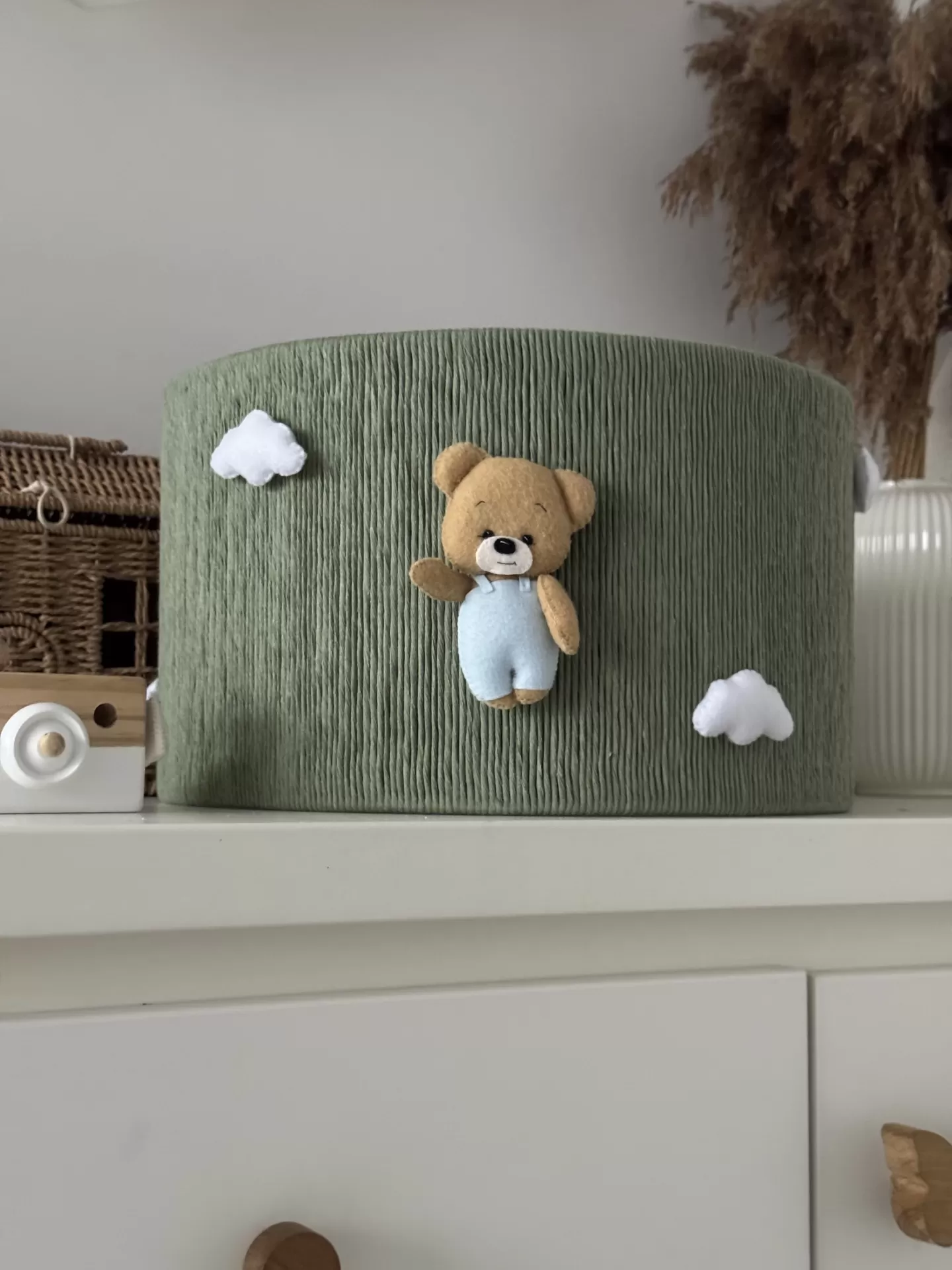 Três nuvens brancas suaves completam este cenário encantador, despertando a imaginação e tornando o ambiente perfeito para brincar, ler ou dormir tranquilamente. Mais que uma simples luz, este abajur artesanal feito com materiais naturais adiciona calor, charme e personalidade ao quarto da criança.