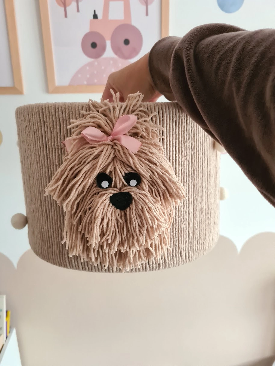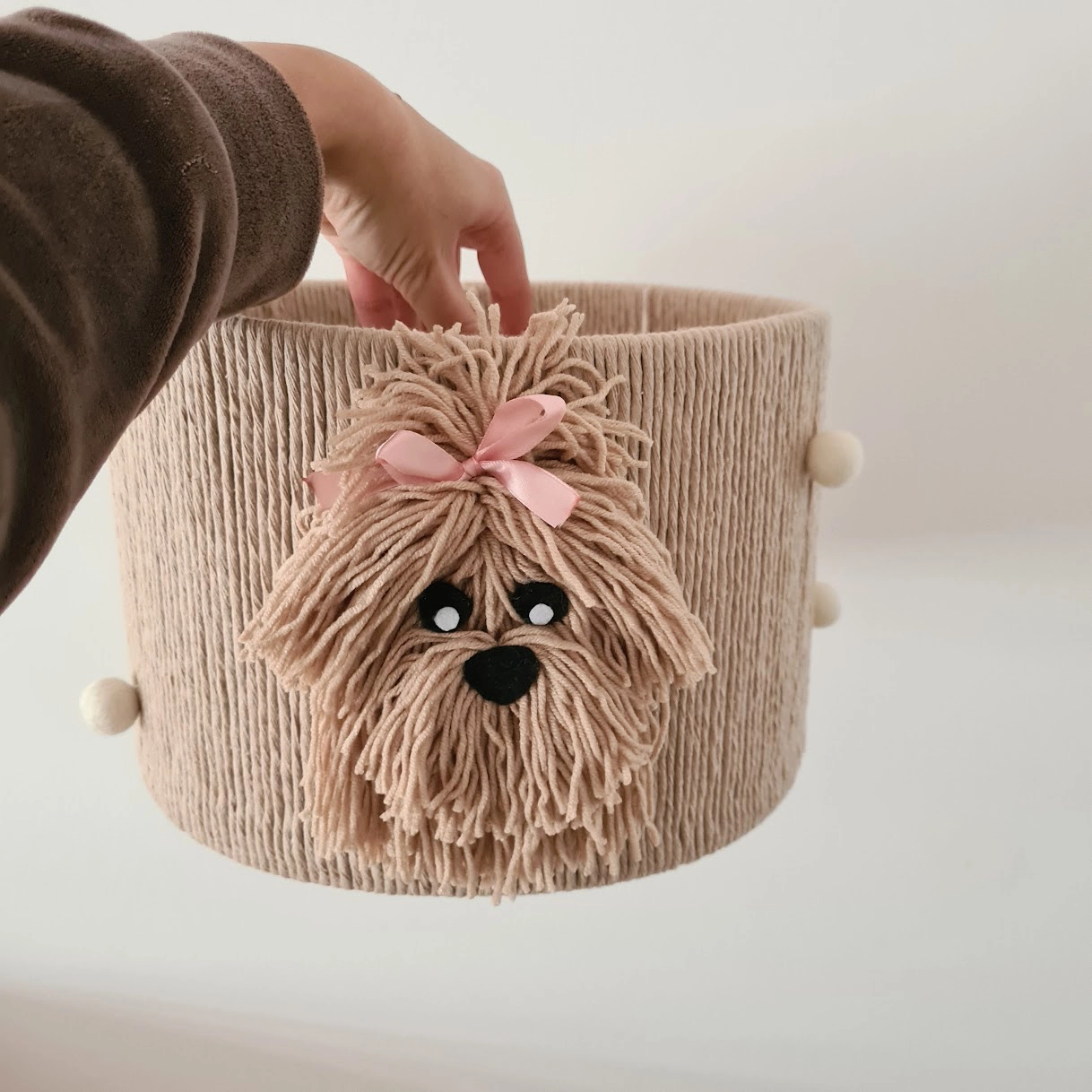 • Cesta redonda de tecido bege com decoração de cão felpudo rosa