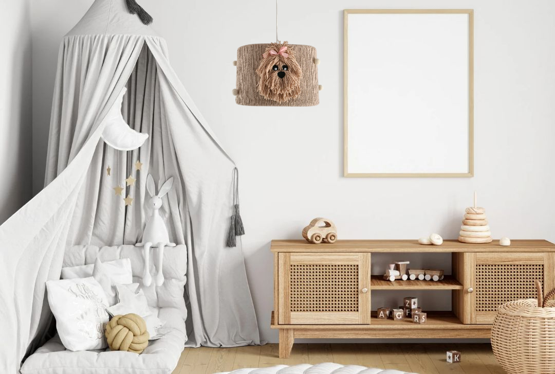 Abajur suspenso com decoração de cão felpudo e laço cor-de-rosa Quarto de criança com decoração em tons neutros e móveis de madeira clara Abajur infantil de tecido com decoração de rosto de cão e laço rosa Luminária pendente com cúpula de tecido bege decorada com figura de cão de fio felpudo Cesta redonda de tecido bege com decoração de cão felpudo rosa Abajur bege pendurado no teto com figura de cão de pêlo comprido e laço cor-de-rosa