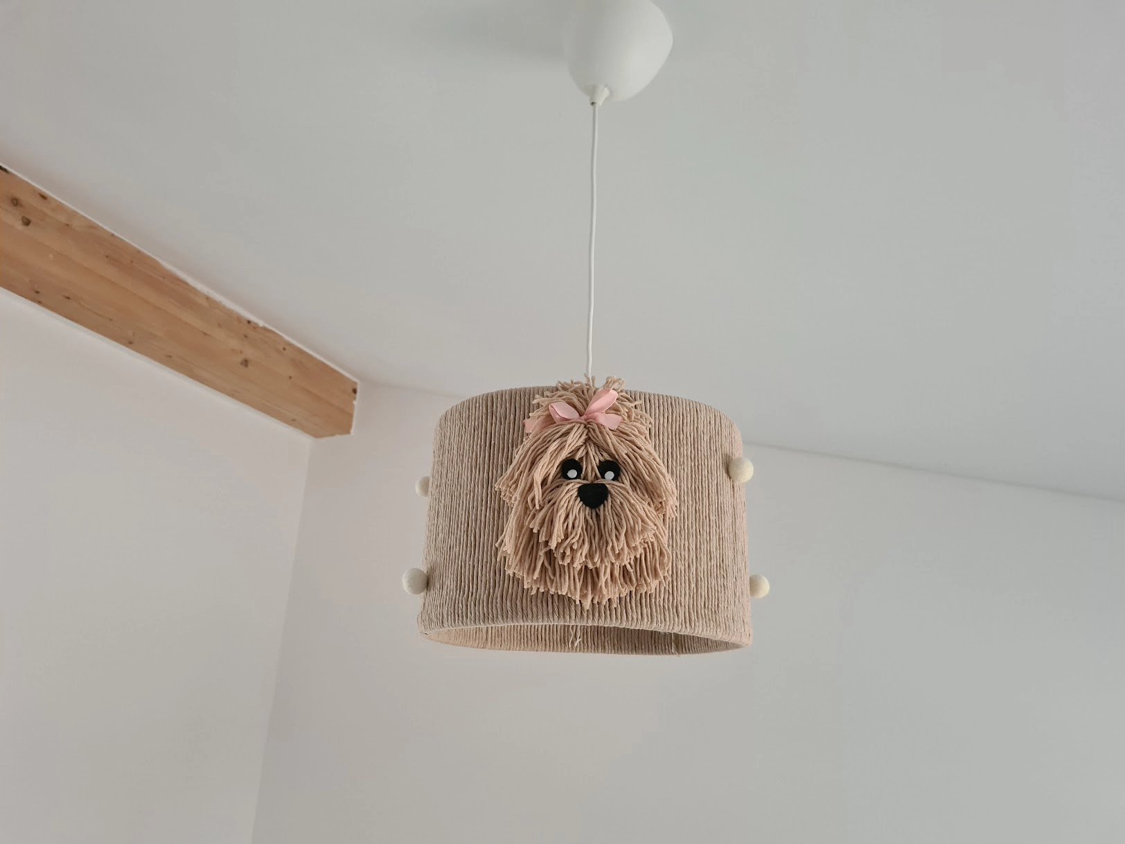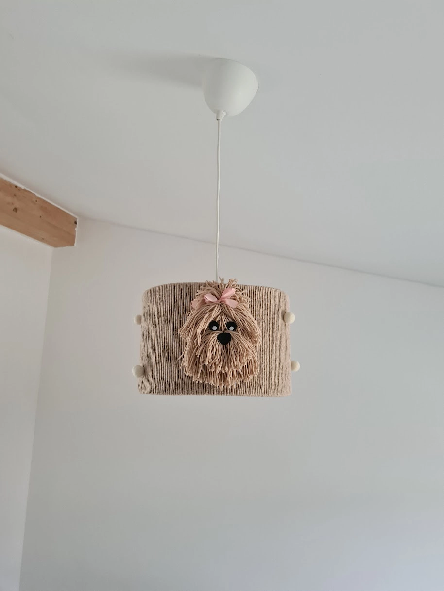 • Abajur bege pendurado no teto com figura de cão de pêlo comprido e laço cor-de-rosa