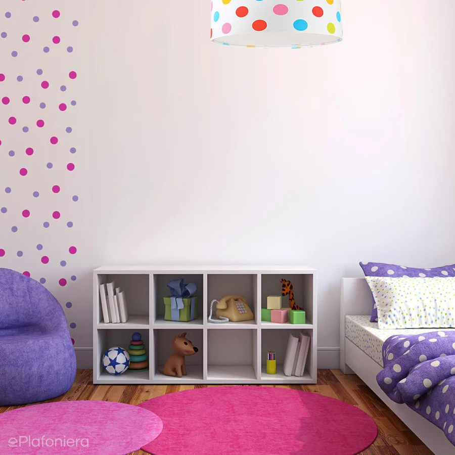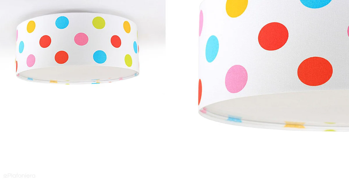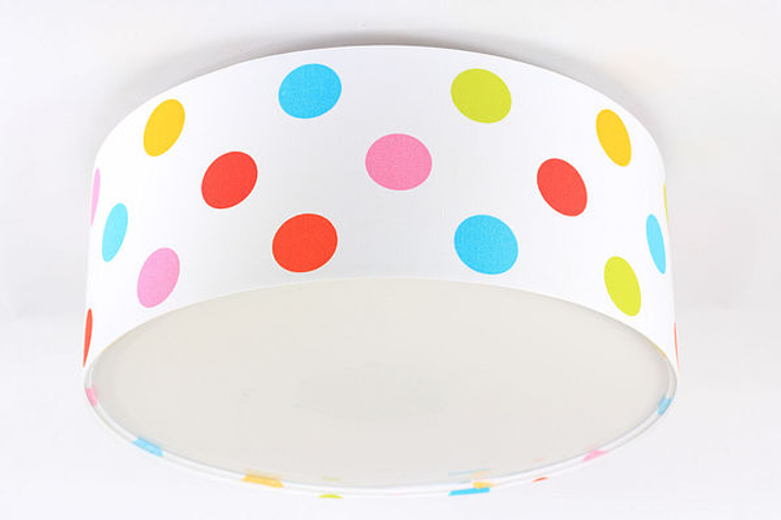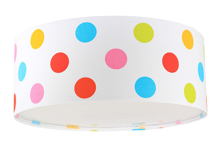 MACIUS um plafon divertido e cheio de personalidade. Com um padrão de bolinhas coloridas sobre fundo branco, este candeeiro é perfeito para estimular a imaginação e criar um ambiente leve, criativo e acolhedor.