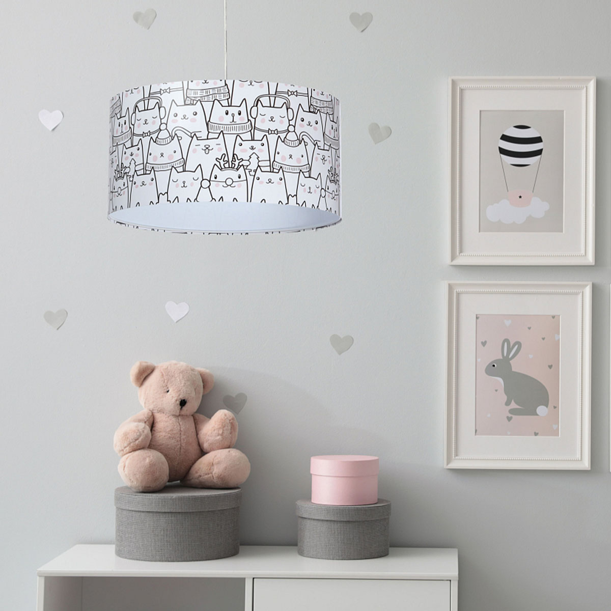 Ideal para quartos infantis ou espaços acolhedores, o candeeiro combina uma iluminação suave e agradável com um estilo moderno e minimalista. Os contornos dos gatos foram impressos em preto sobre fundo claro, criando um efeito visual leve e expressivo, que agrada tanto a crianças quanto a adultos.