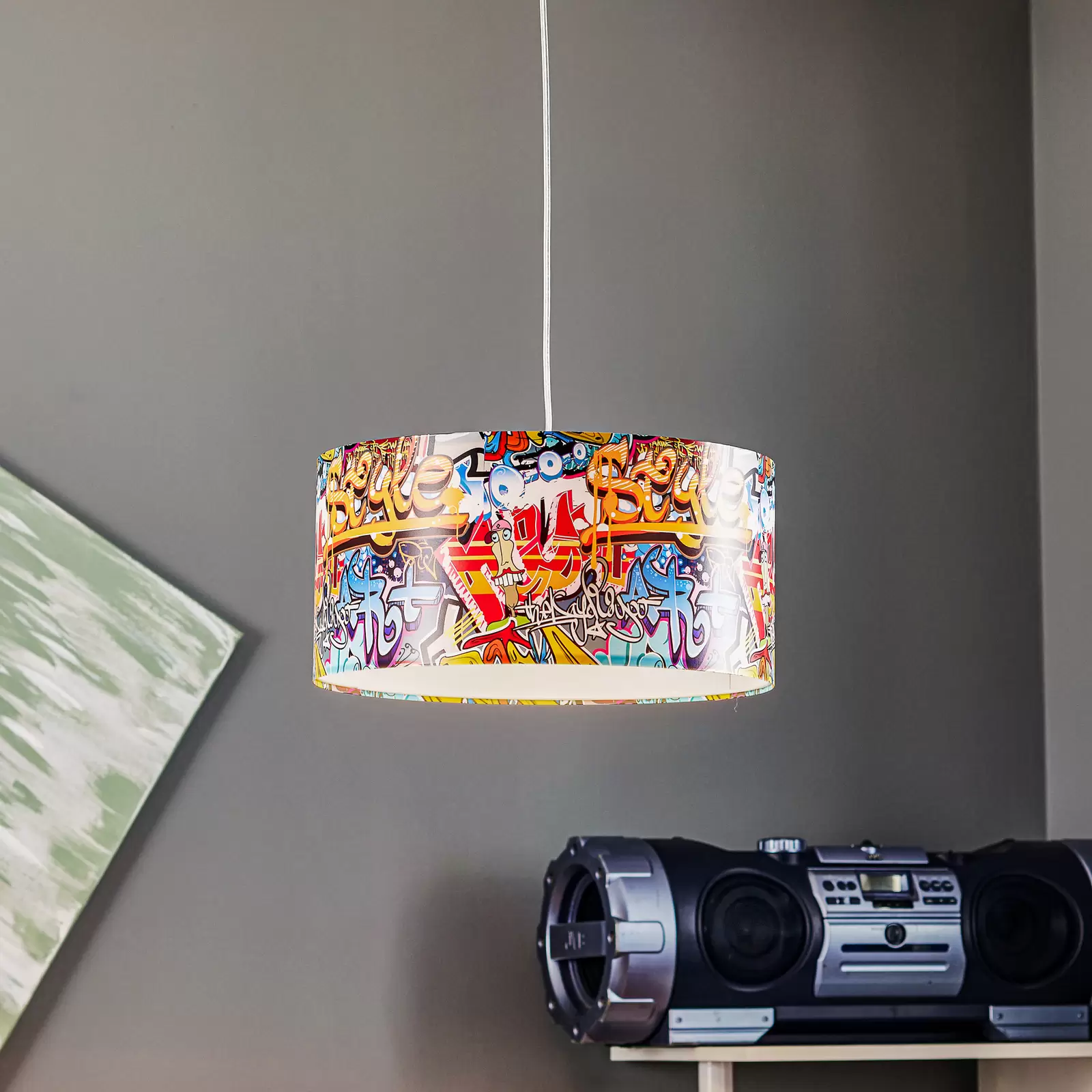 Transforme o quarto de um adolescente com personalidade com o vibrante Candeeiro Suspenso GRAFFITI. Inspirado na arte urbana, este modelo traz o espírito livre e criativo do street art para dentro de casa, criando um ambiente autêntico, moderno e cheio de expressão.