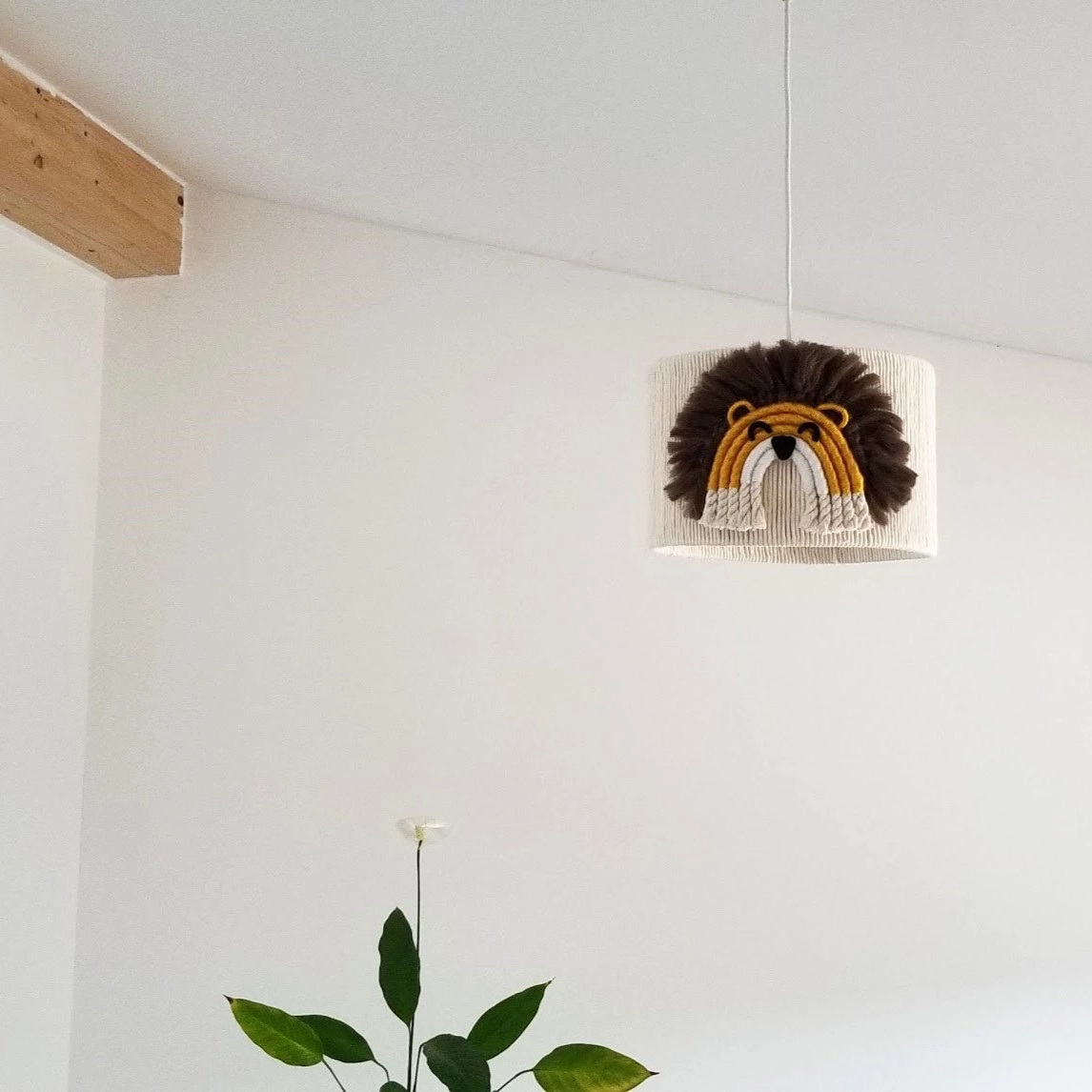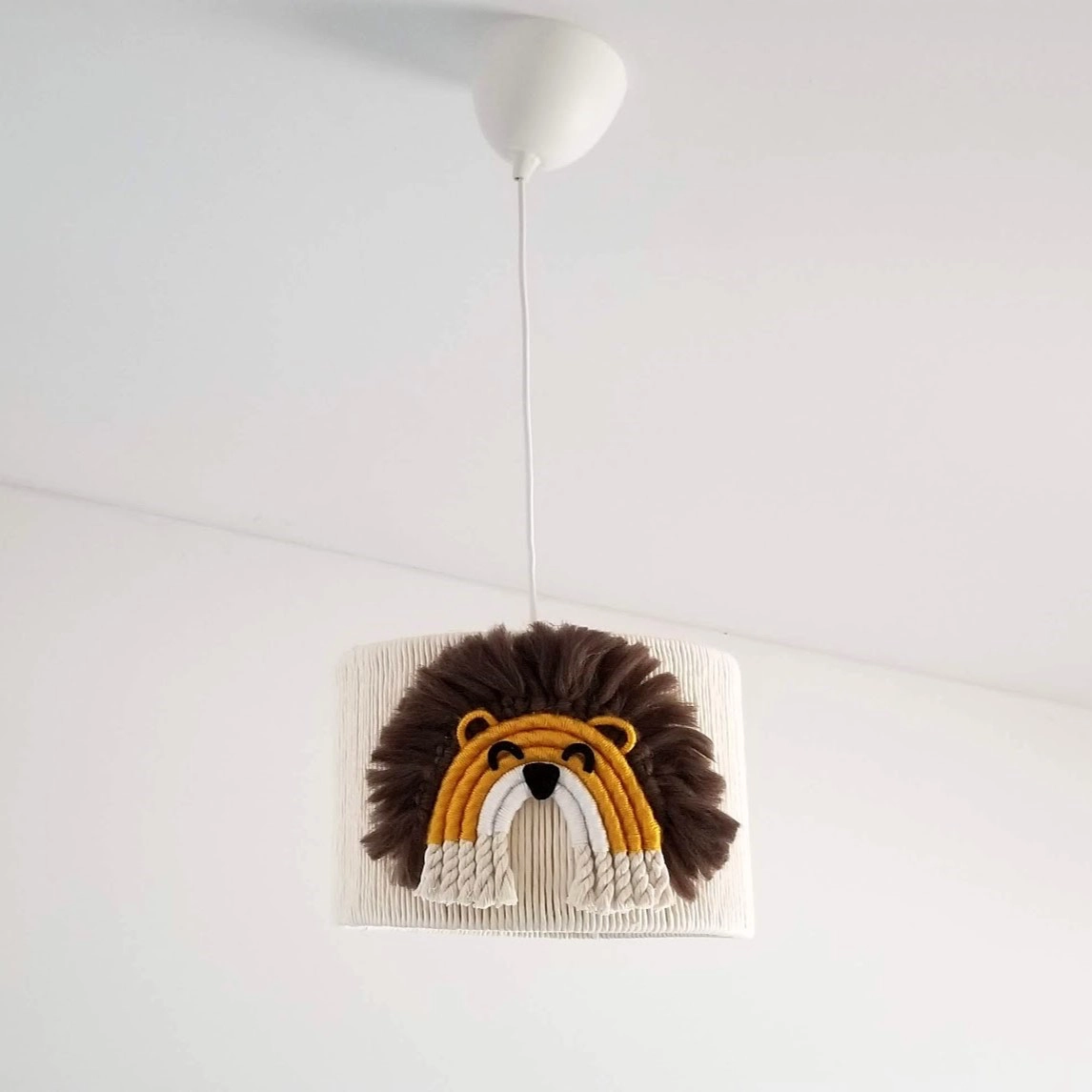 • Candeeiro de teto infantil com cúpula branca e decoração de leão de fios coloridos