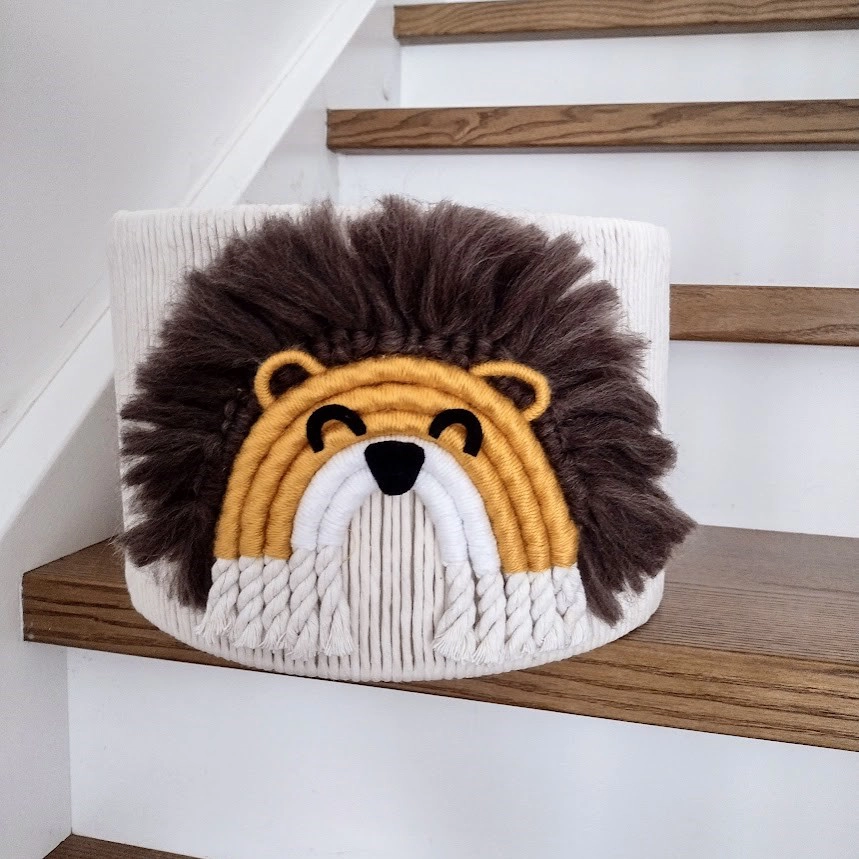 • Cesto de armazenamento tecido creme com aplique de leão colorido em fios