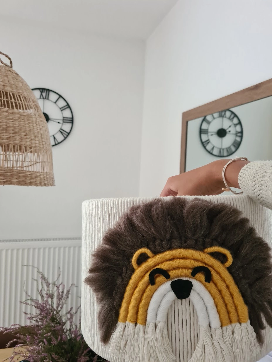 Candeeiro de tecto com decoração de leão em macramé Almofada decorativa de leão com fios coloridos e textura trançada numa cadeira branca. Luminária suspensa com abajur de crochê com rosto de leão em várias cores, pendurada em teto branco Candeeiro de teto infantil com cúpula branca e decoração de leão de fios coloridos Cesto de armazenamento tecido creme com aplique de leão colorido em fios Cesta decorativa em forma de leão com juba castanha numa escada de madeira
