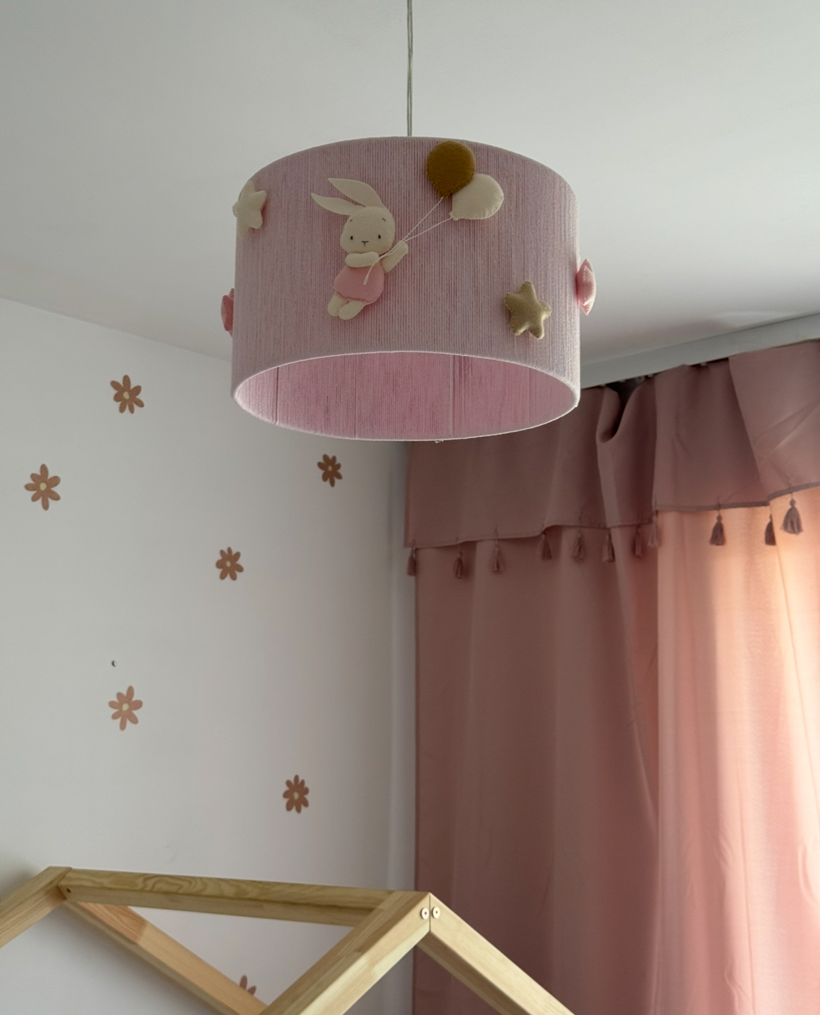 O abajur de teto, feito em cordão de algodão de 5 mm cuidadosamente enrolado numa estrutura metálica, é adornado com delicados coelhinhos de feltro, balões e estrelas. Em tom rosa suave, proporciona uma iluminação central suave e decorativa. Altura: 20 cm | Diâmetro: 35 cm
