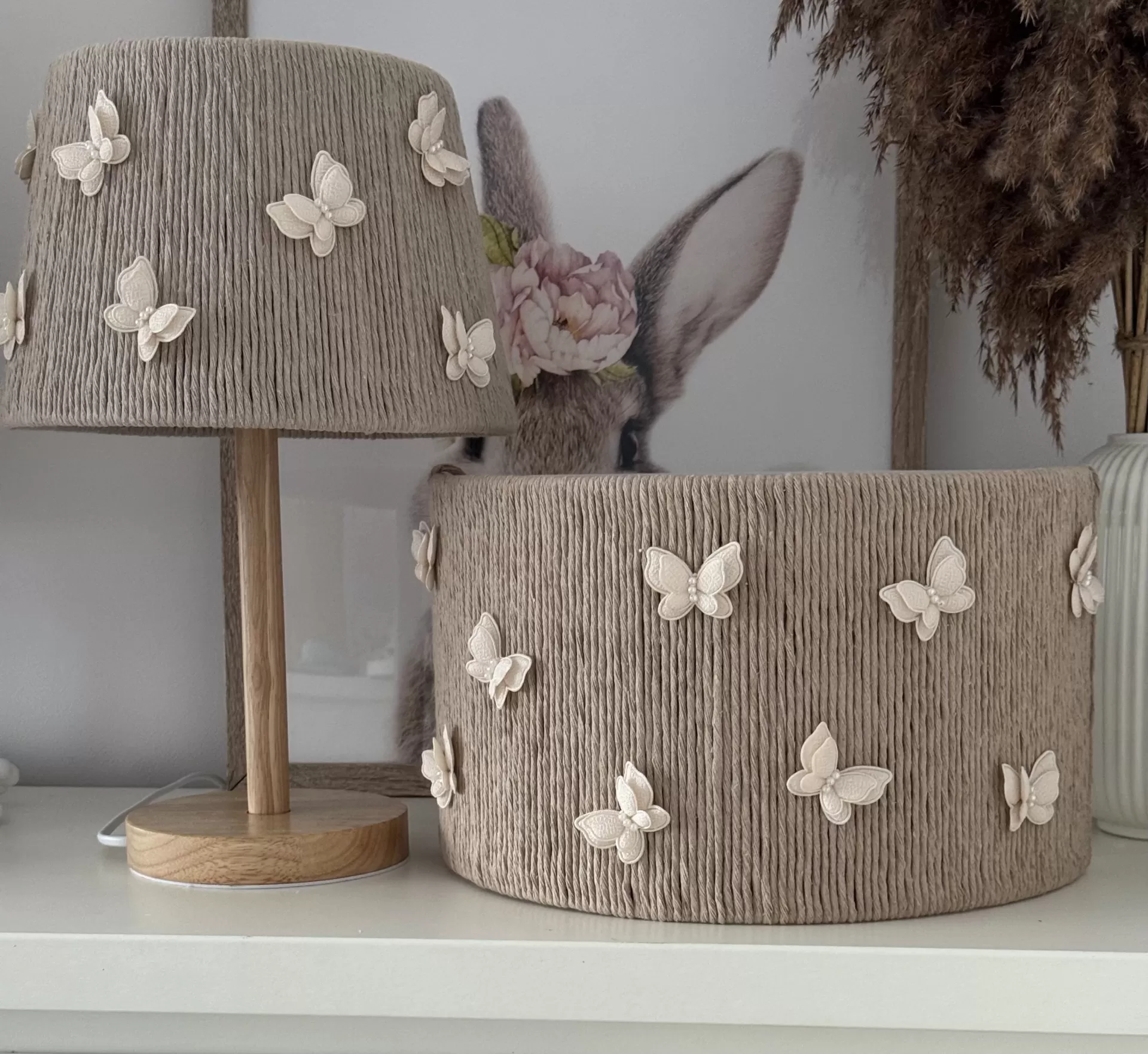 Encante o quarto infantil com o Conjunto de Candeeiros Pequenas Borboletas, composto por abajur (Ø 30 cm x 20 cm) e candeeiro de cabeceira (Ø 40 cm x 25 cm).