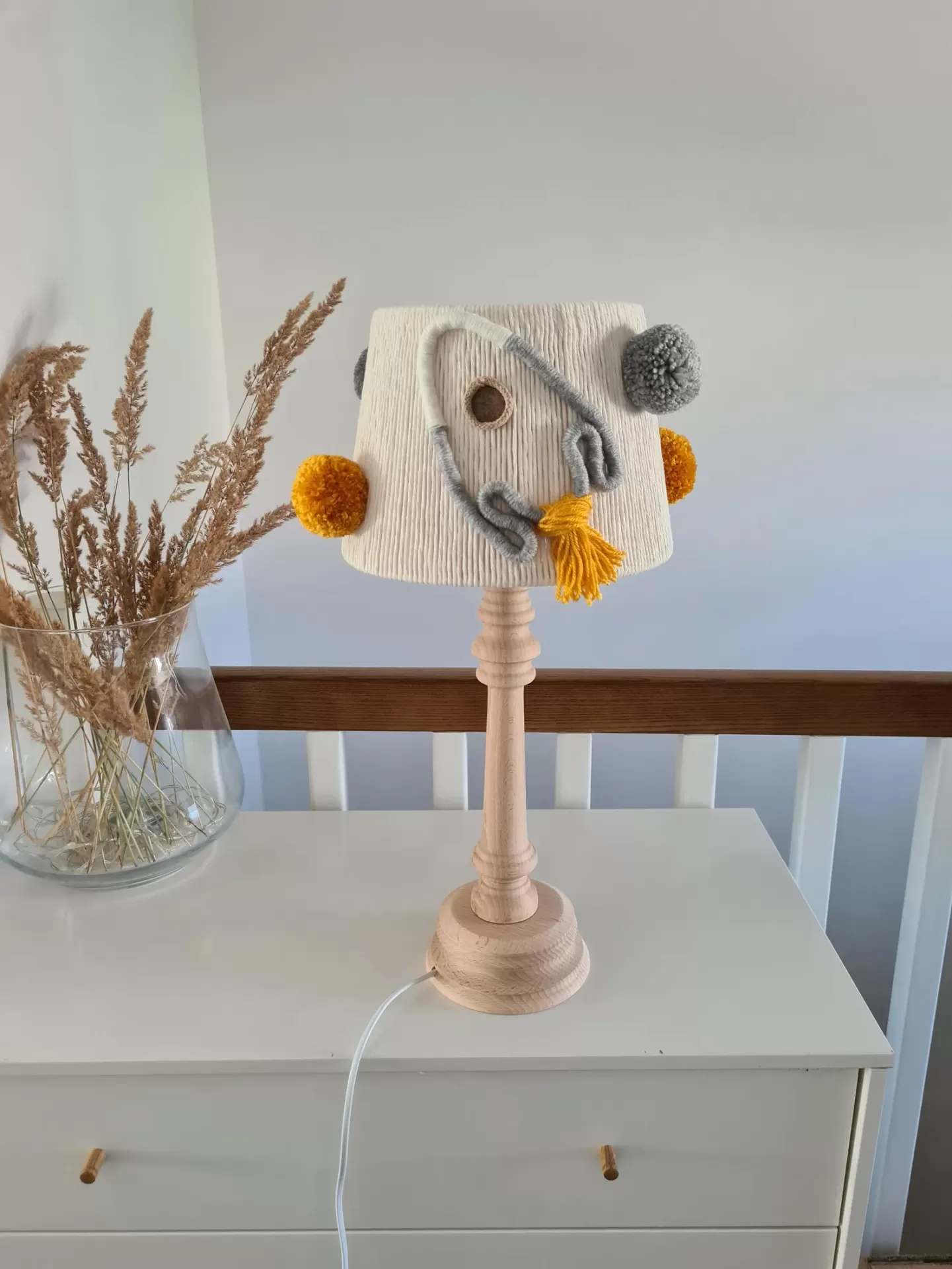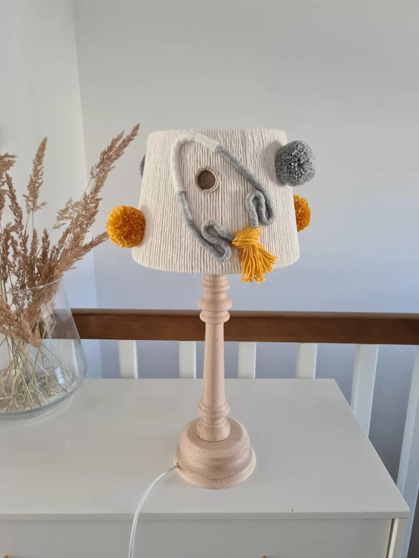 Ideal para complementar a iluminação, o abajur de mesa é tecido em macramê, decorado com dois foguetes e quatro pompons fofinhos. A base em madeira neutra, sem manchas, com rosca para lâmpada LED E14 garante segurança e qualidade.